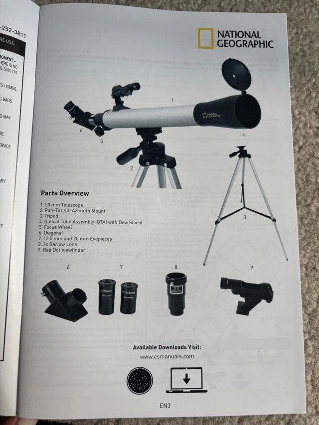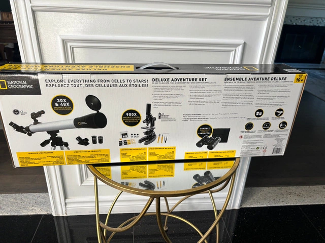 0National Geographic Deluxe Adventure Set Item: 2927028 Model: 80-30103 Items all in original packaging The National Geographic Deluxe Adventure Set gives young discoverers all they need to explore everything from the terrestrial to the celestial by offering a telescope, microscope and a pair of binoculars in one versatile kit. Designed with emerging astronomers in mind, the set's classic refractor telescope has a 50mm aperture that can reveal the Moon's cratered surface as well as intriguing planetary features like Jupiter's Galilean moons or Saturn's rings. Two interchangeable eyepieces allow users to experiment with two different magnifications of 30x and 48x. Additional accessories include a panhandle mount that is easy for small hands to control, a full size tripod and a red dot finder for navigating the night sky. For Sale By: Owner