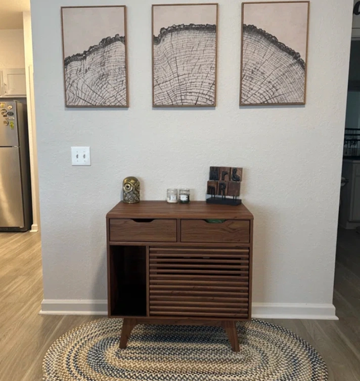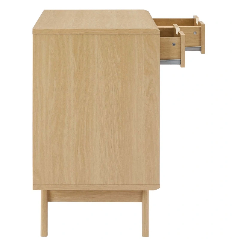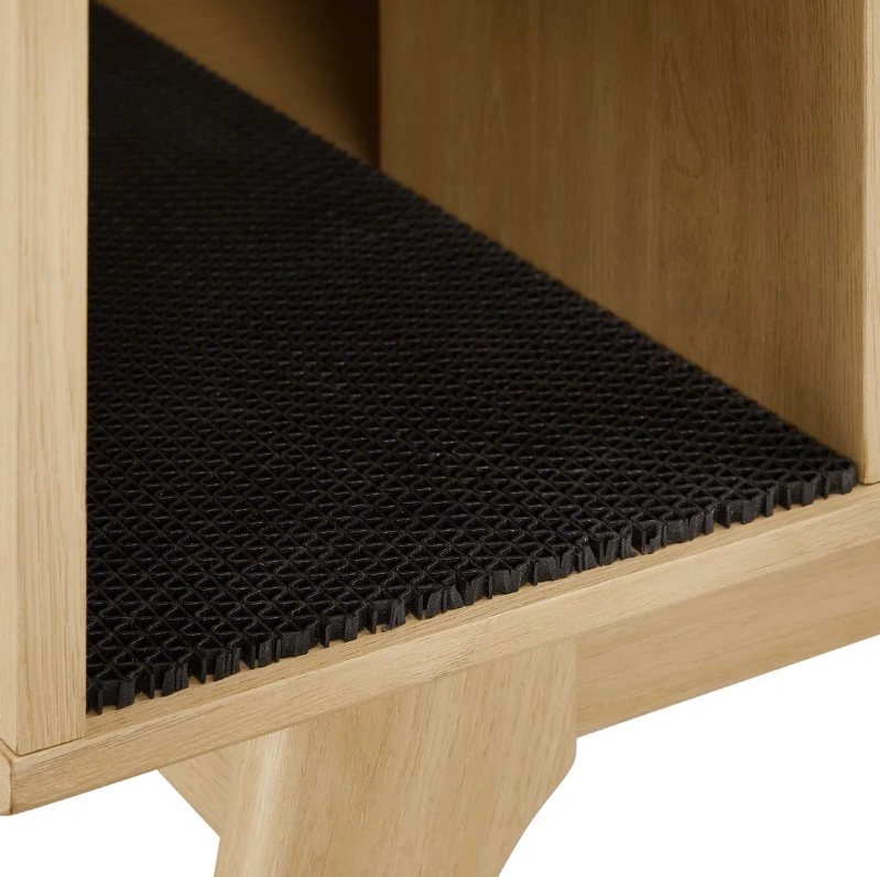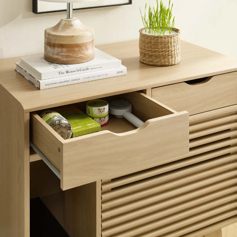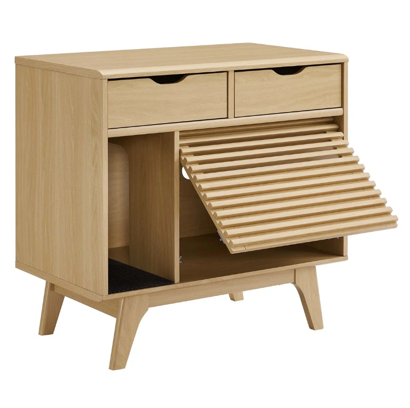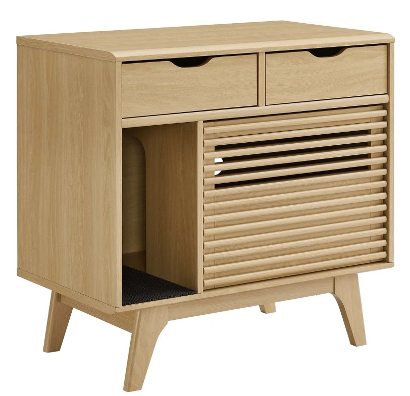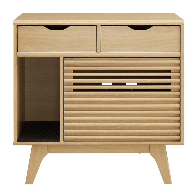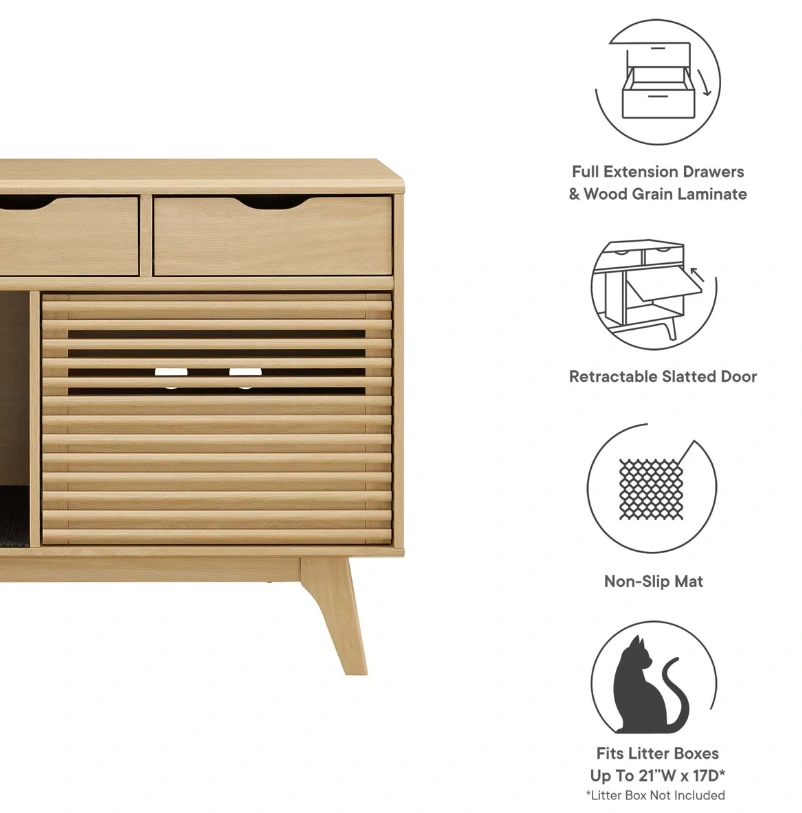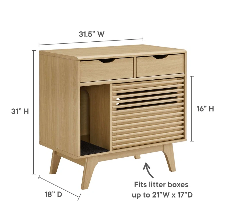 Tap into mid-century aesthetics with the Render Cat Cabinet, an ideal solution for your cat litter box needs. This sturdy cat litter furniture piece features a durable MDF and particleboard frame with a smooth wood grain laminate, perfect for blending into your home decor. This pet cabinet includes two full-extension drawers, ideal for storing cat supplies or other small items, and a retractable slatted door with a push-to-open locking mechanism, offering discreet coverage for a hidden litter box while providing easy access for cleaning. The open compartment, fitted with a non-slip mat, includes a cutout leading to the cat litter box (litter box not included), allowing your cat to easily enter and exit while keeping the area clean and tidy. Additionally, the slatted door allows for ventilation and some light, making it a comfortable, enclosed litter box space for your cat. The Render cat cabinet is equipped with non-marking foot pads, protecting your floors and providing stability. Designed for easy assembly, this stylish and functional piece is perfect for keeping your living space neat. Customers can also purchase a separate litter box mat to place in front of the litter box cabinet, enhancing cleanliness and further reducing tracked litter around the home. Ideal for any modern pet owner's home, office, or apartment, the litter enclosure supports up to 71 lbs on the bottom shelf. Litter box not included. Features Mid-Century Litter Box Enclosure MDF and Particleboard Construction Wood Grain Laminate Retractable Slatted Door Non-Slip Mat Litter Box Not Included Assembly Required