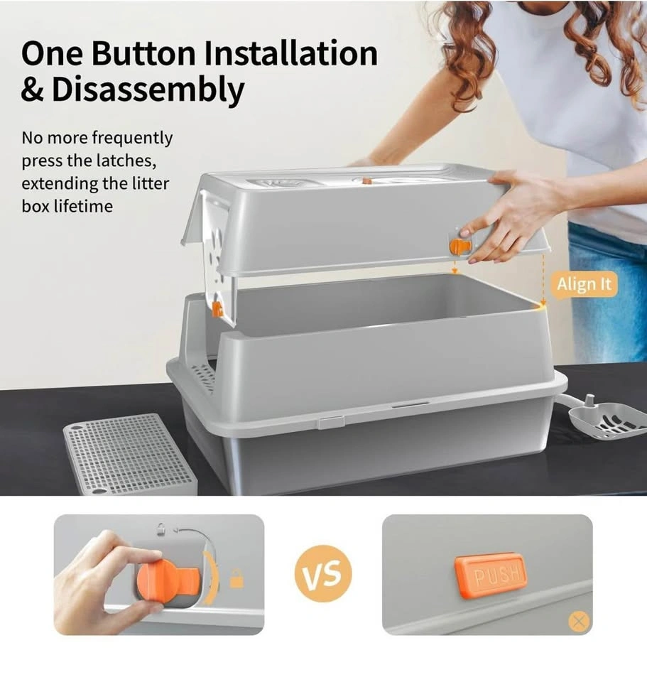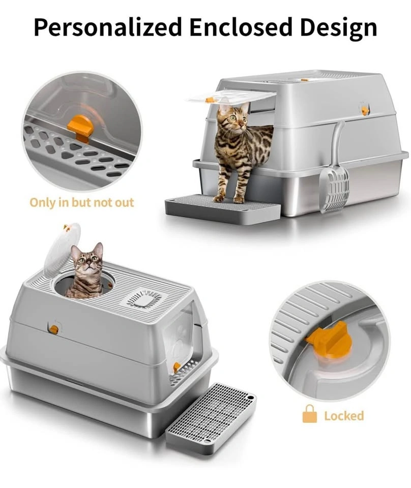 Eosarcu enclosed cat litter box features carbon filters to absorb odor effectively. The size is 23.62" x 15.74" x 15.74", which can hold 20L litter. The high-wall provides privacy space, perfect for big cats and multi-cat families. Stainless steel with high sides removable lid effectively prevents urine leakage and odors. You can choose two modes (semi-enclosed or enclosed) based on your pet's preference. Easy to clean and durable, made of stainless steel, which is non-stick. It is sturdy and durable with service life 3-5 years. Designed with easy assembly modular system, which support enclosed litter box and semi-enclosed configurations. Cats can enter through the front door and exit from the top lid or enter and exit from top lid, preventing litter tracking. Equipped with removable top lid, litter scoop with holder, carbon filters and a footboard. Pick up - Courtice Please check my other listings!