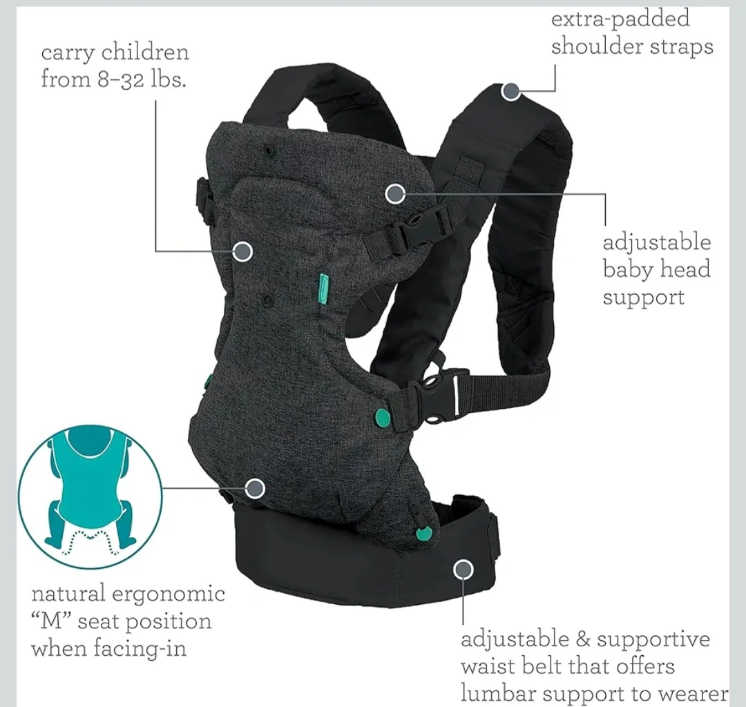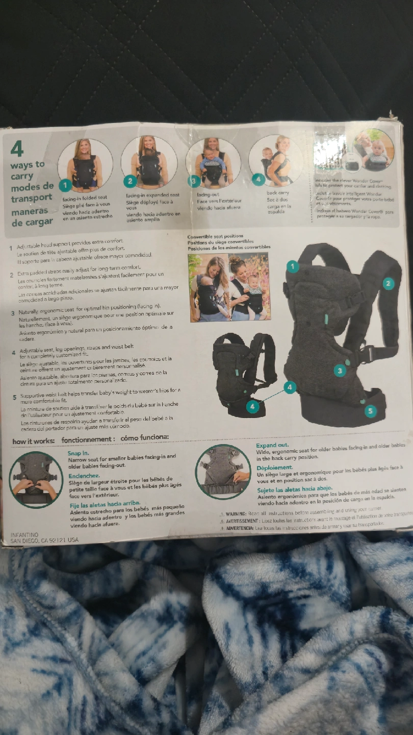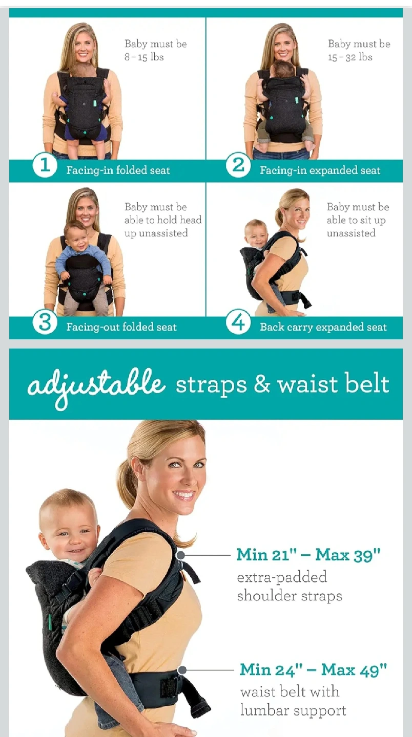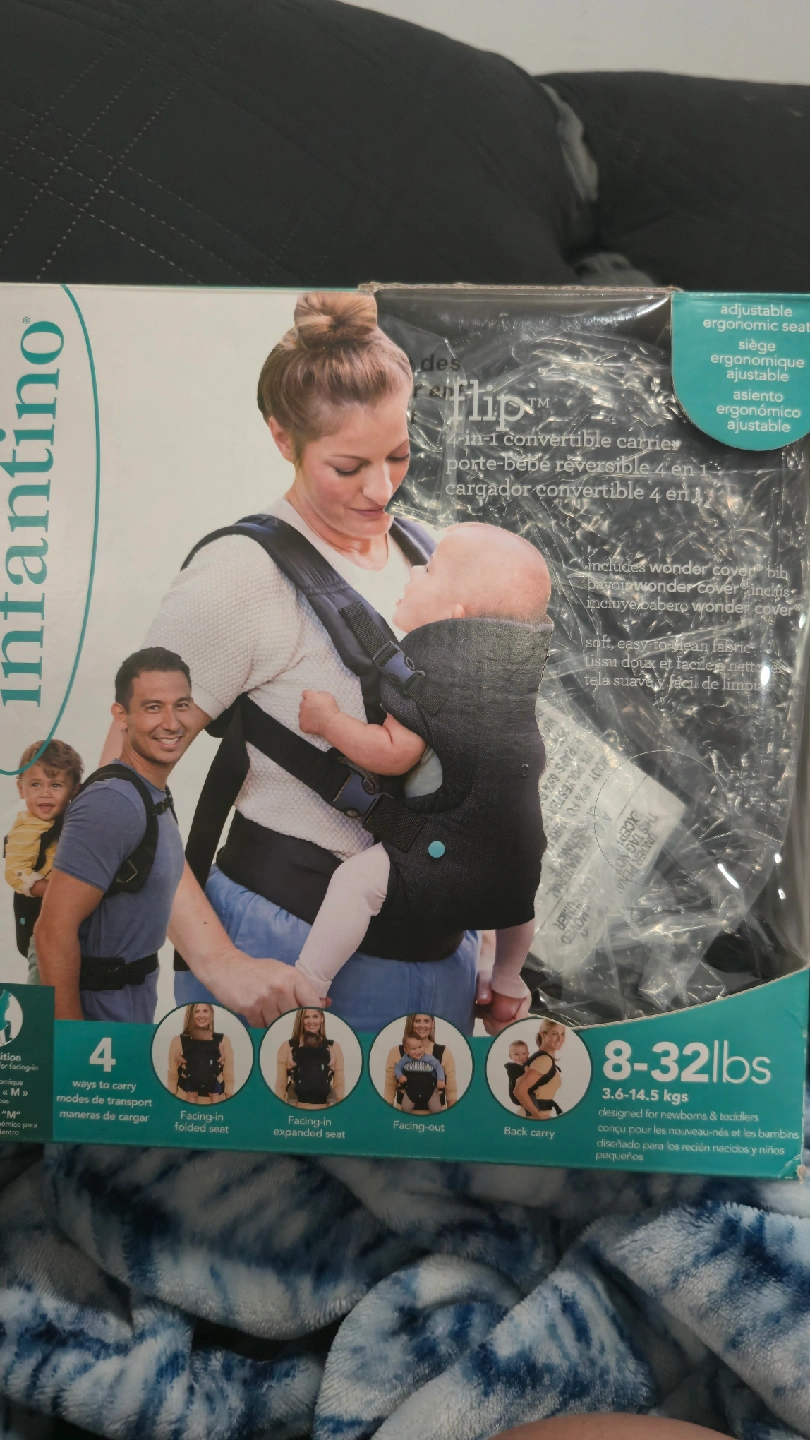 10Brand New - Infantino Flip 4-in-1 convertible baby carrier! This carrier is designed for newborns and toddlers, supporting children from 8-32 lbs (3.6-14.5 kgs). It offers 4 ways to carry your little one: facing-in (folded seat), facing-in (expanded seat), facing-out, and back carry. It features adjustable straps and a waist belt for comfortable wear. The original box is included!
