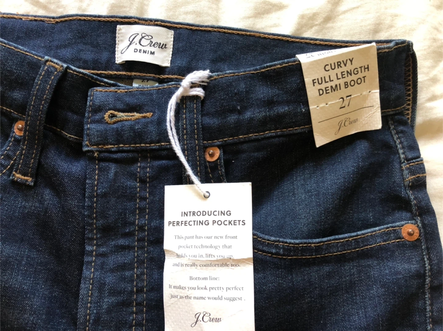 115These are brand new J.Crew denim jeans, never worn and still with the tags attached! They're a curvy fit, full length, and demi boot style in a dark wash. Size 27. The new front pocket technology holds you in, lifts you up, and is really comfortable too!