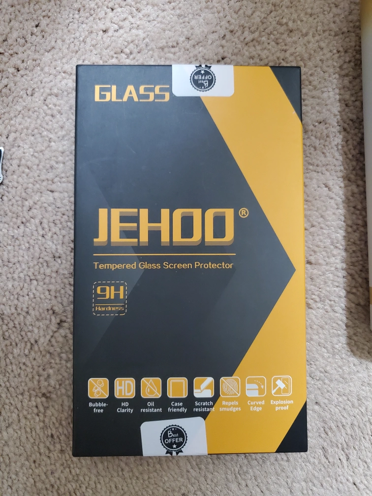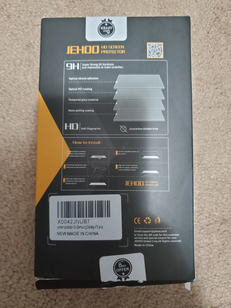 43Selling a brand new JEHOO tempered glass screen protector for Samsung Galaxy S10 Plus. It has 2 screen protectors inside. Comes with installation kit. It has 9H hardness for scratch resistance. Features include optical silicone adhesion, optical PET coating, tempered glass material, HD clarity, bubble-free, oil resistant, repels smudges, has a curved edge and nano-plating coating. Brand new. Box is opened but did not end up using it.