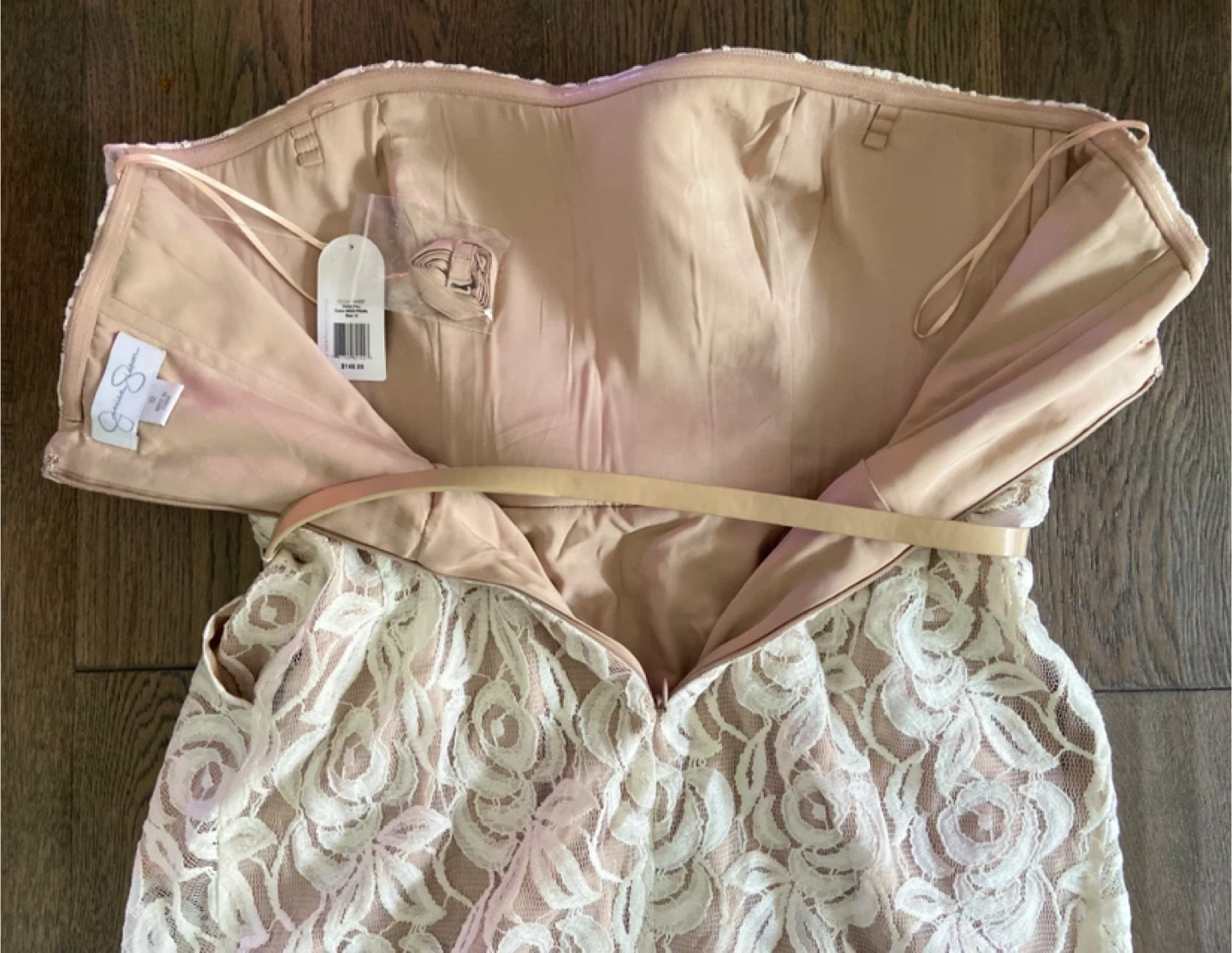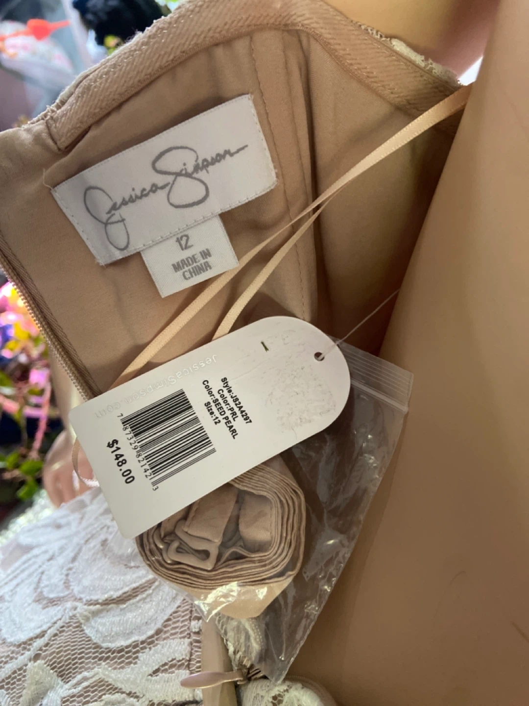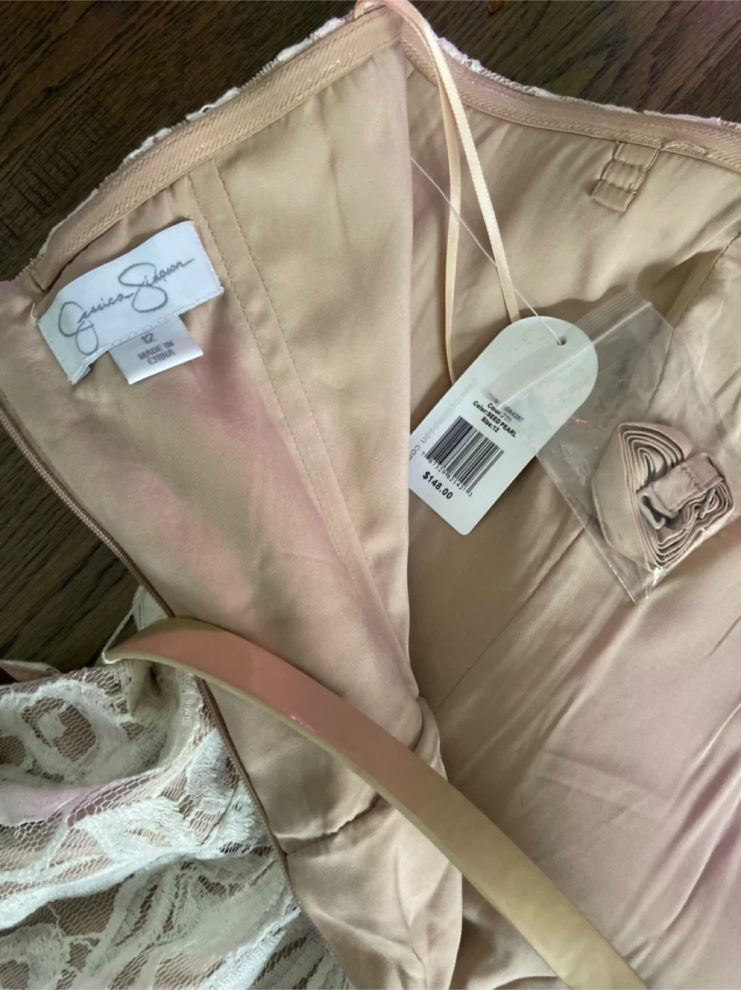 83Selling a cute Jessica Simpson lace strapless mini dress! It features a beautiful lace overlay and comes with a matching belt to cinch the waist and matching beige straps that are adjustable and removable Features hidden side pockets Size 12 Perfect for a night out or a special occasion
