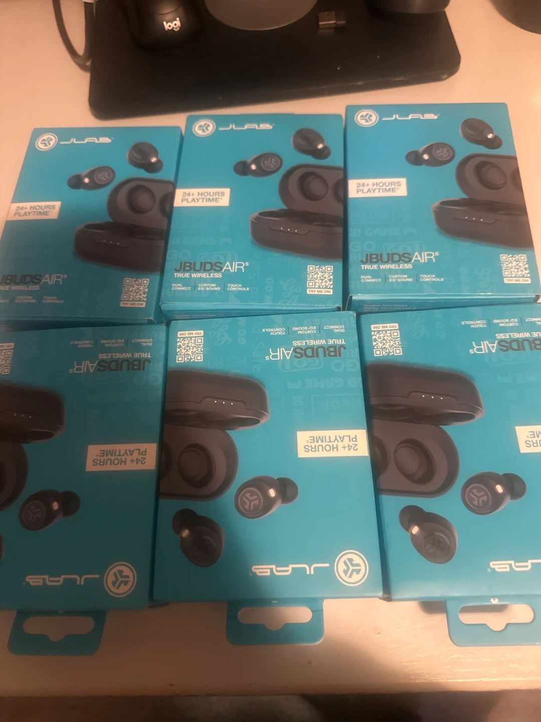 10I have new JLab JBuds Air True Wireless Earbuds for sale. They offer 24+ hours of playtime and custom EQ sound. The box includes the earbuds, charging case with integrated charging cable, and 3 sets of gel eartips. They also feature touch controls and dual connect for either earbud