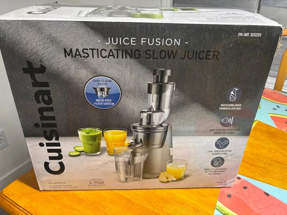 Cuisinart Slow processing juicer. Brand new Features: • Includes mesh-free easy clean filter • Removable parts are top rack dishwasher safe • Fresh produce, nuts, and greens are slow pressed for the most efficient extraction