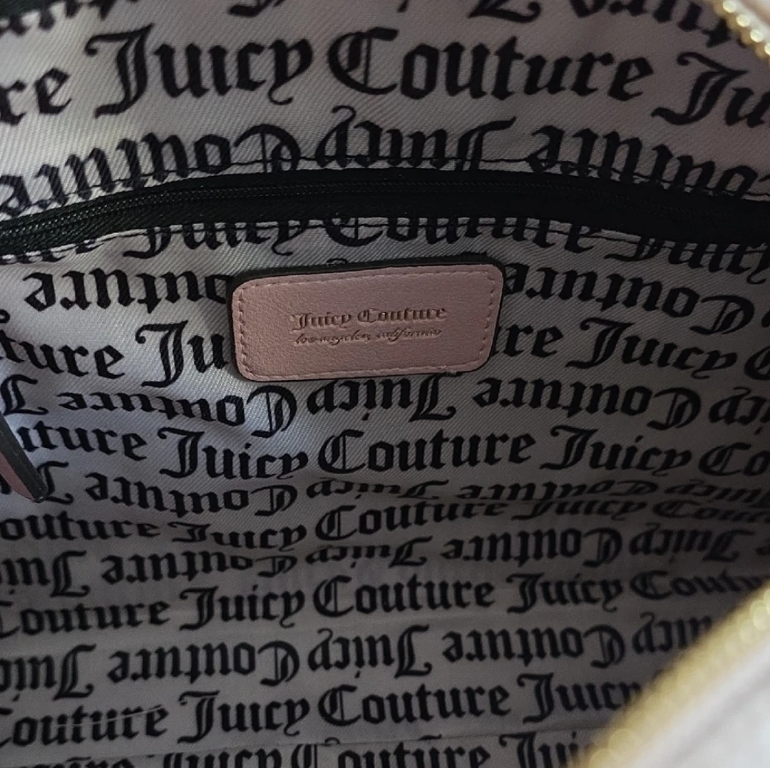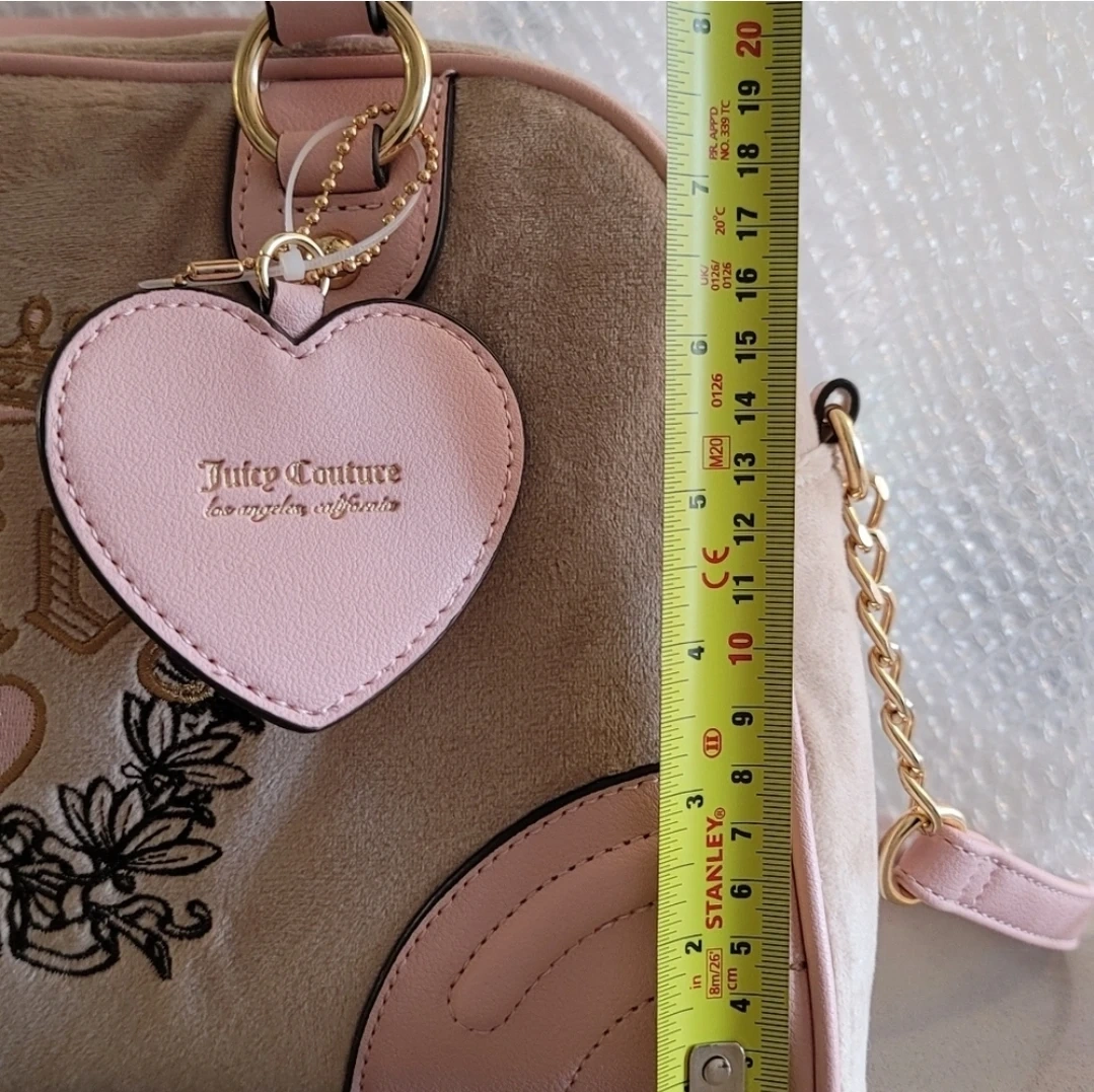 37Stylish Juicy Couture satchel with pink accents. Features elegant embroidery and heart charm. ⭕️ Brand new, but tag was removed (thought of using it but I changed my mind) ⭕️ Velvety feel ⭕️ Measurements: see last 3 photos ⭕️ Non-detachable crossbody strap ⭕️ Neutral colour but still looks pretty 📍Meet up in Kingsway Mall or at Purolator store in 11220 104 Ave. NW Edmonton. 💰 This item is new and never used. Accepting reasonable price offers only. Thanks for dropping by!