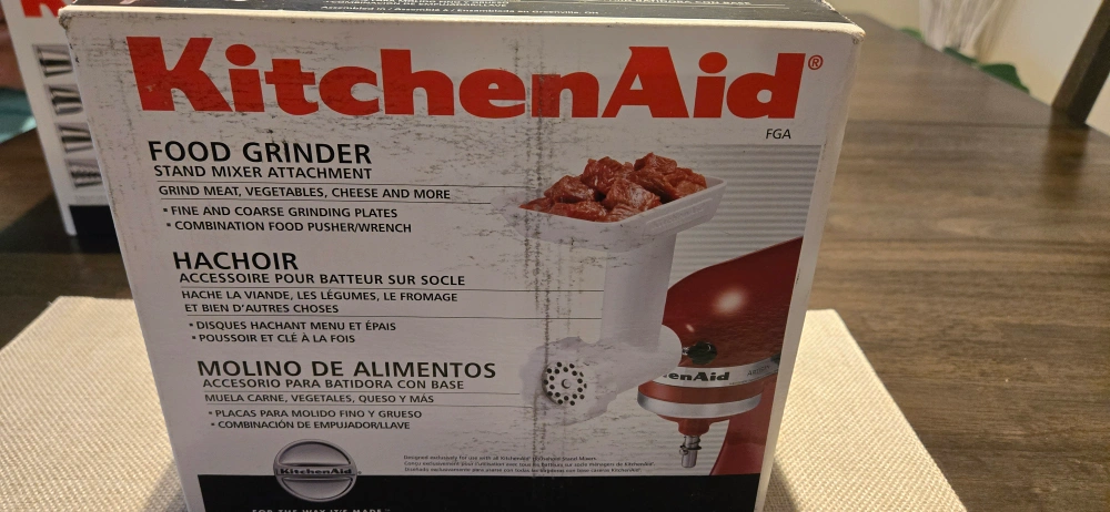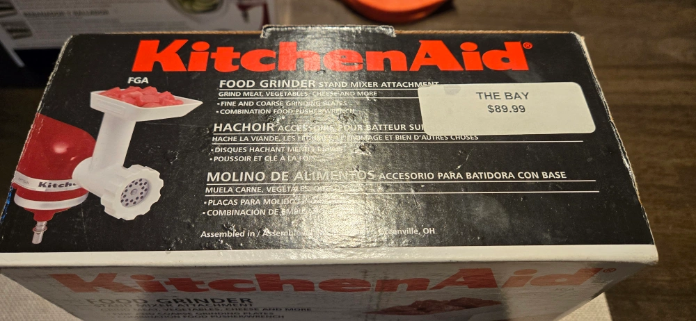 108I'm selling a brand new in box never used KitchenAid FGA food grinder stand mixer attachment! This attachment is designed to grind meat, vegetables, cheese and more. It comes with fine and coarse grinding plates, as well as a combination food pusher/wrench. It was originally bought for $89.99 at The Bay and includes the box