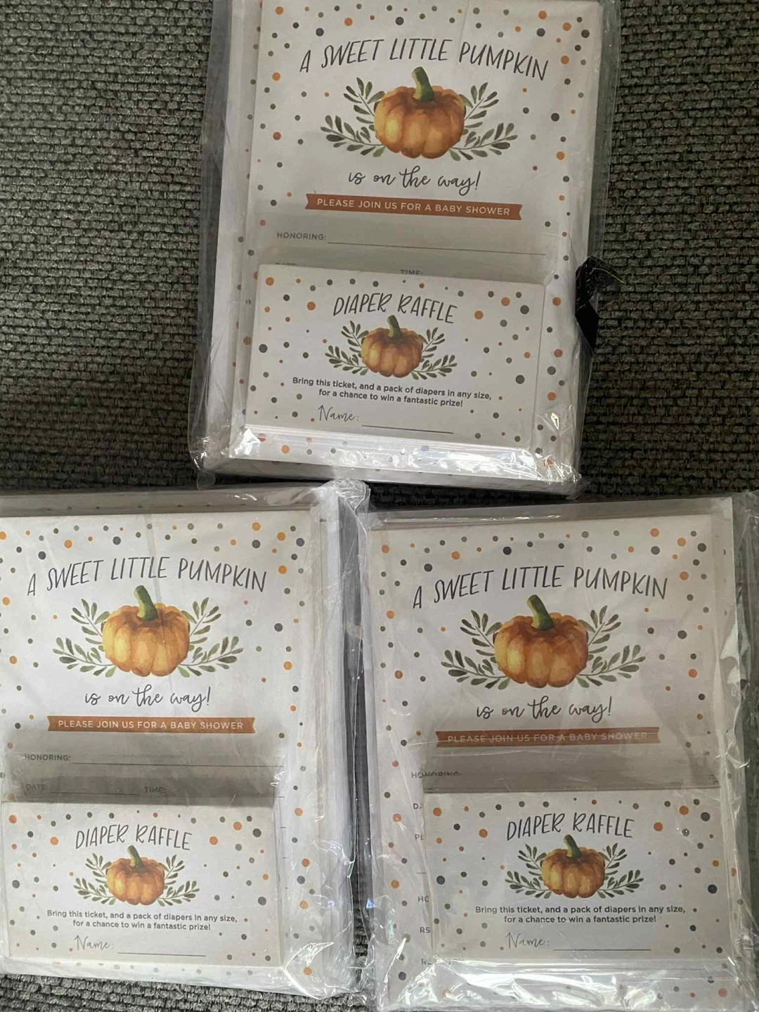 45I have a set of Koko Paper Co. Sweet Little Pumpkin baby shower invitations and diaper raffle tickets. They feature a rustic fall design with autumn colours, leaves, and chevron stripes. Each set includes 25 fill-in-style cards, envelopes, and raffle tickets. They are brand new in the packaging! Each pack contains 25 $15 per pack or $40 for all three packs Pick up only Park and Gibb Oshawa