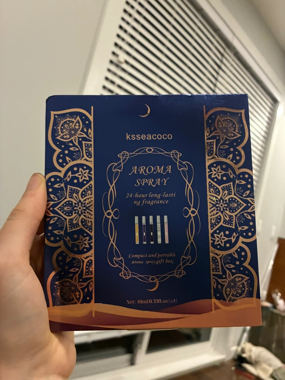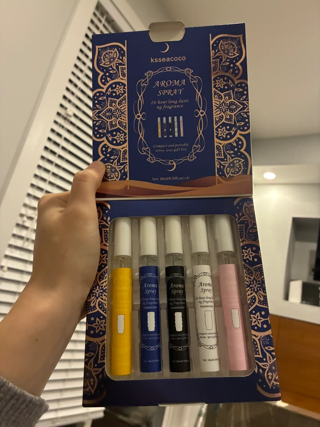 47Selling a brand new Ksseacoco Aroma Spray gift box! It contains 5 different aroma sprays, each with 10ml/0.33fl.oz. The packaging says they are compact and portable, perfect for on-the-go use