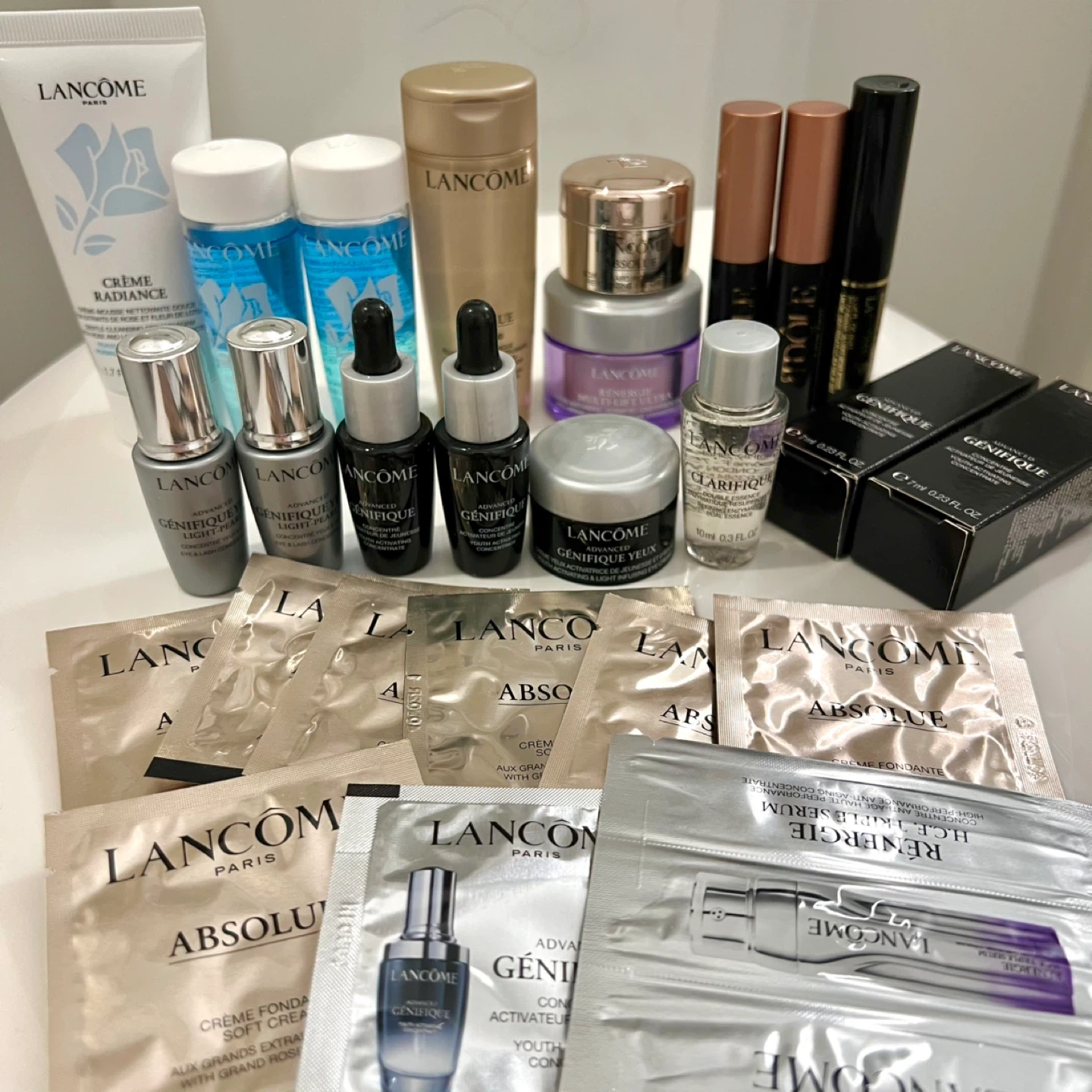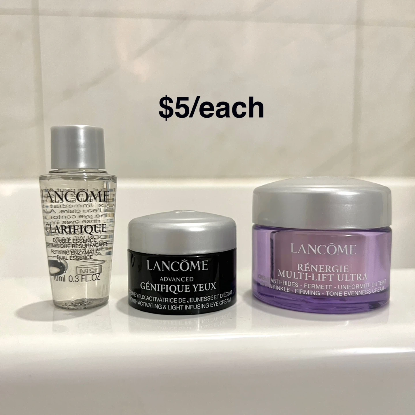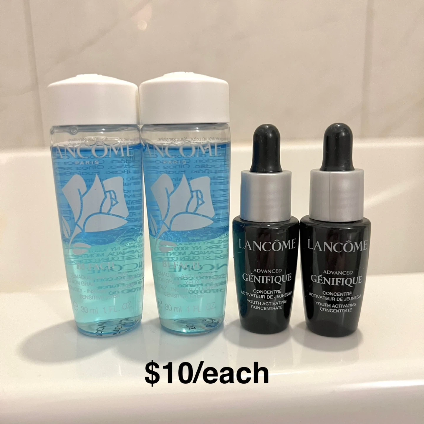 120Selling brand new Lancôme products and samples! Price negotiable, offer lower bundle price if purchase more! Date is very new. For $5: - 10ml Clarifique Dual Essence - 5ml Génifique Eye Cream (half used) - 15ml Lift Night Cream (purple jar 1/3 left) For $10: - 30ml Bi-facial Makeup Remover - 7ml Youth Activating Concentrate For $15: - 50ml Classic Cleanser - Idole & Drama Mascara - 5ml Eye & Lash Concentrate For $25: - 50ml Absolue Toning Lotion - 5ml Absolue Soft Cream For $28: - Dior, La Mer, Lancôme, Farmacy samples Blue Lancôme makeup bag: $18 Red Lancôme makeup bag: 15