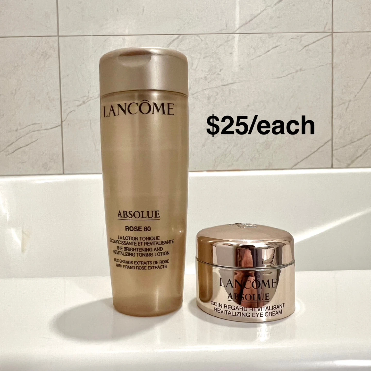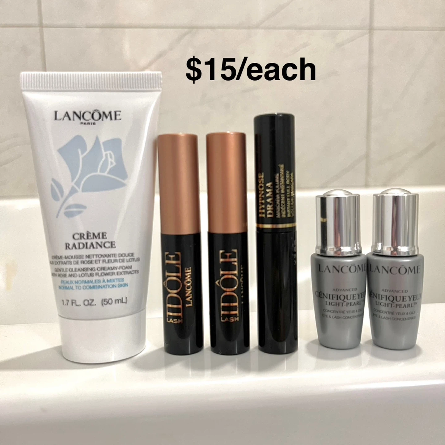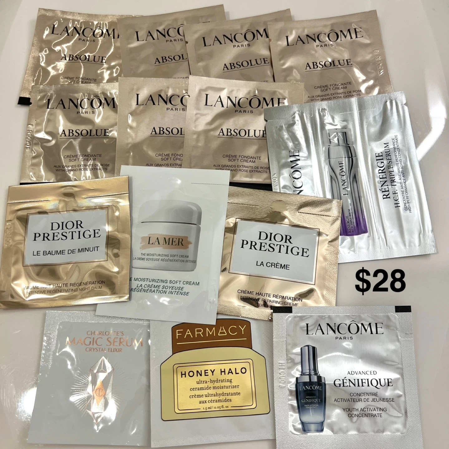 120Selling brand new Lancôme products and samples! Price negotiable, offer lower bundle price if purchase more! Date is very new. For $5: - 10ml Clarifique Dual Essence - 5ml Génifique Eye Cream (half used) - 15ml Lift Night Cream (purple jar 1/3 left) For $10: - 30ml Bi-facial Makeup Remover - 7ml Youth Activating Concentrate For $15: - 50ml Classic Cleanser - Idole & Drama Mascara - 5ml Eye & Lash Concentrate For $25: - 50ml Absolue Toning Lotion - 5ml Absolue Soft Cream For $28: - Dior, La Mer, Lancôme, Farmacy samples Blue Lancôme makeup bag: $18 Red Lancôme makeup bag: 15