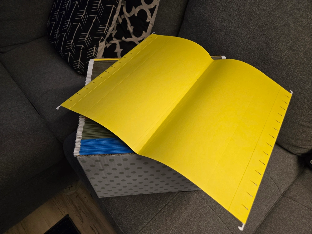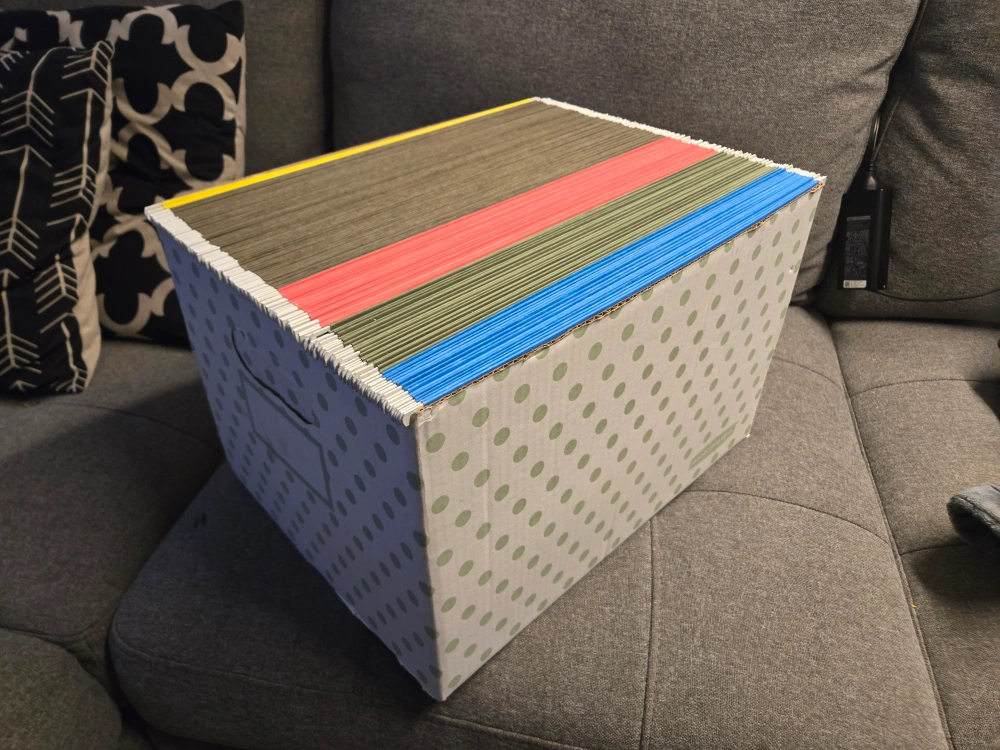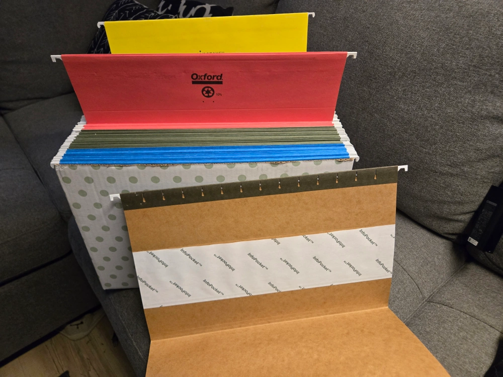 Selling a set of 14" hanging file folders. Brand new condition. about 100 in total. They come with a box for easy storage and organization. The folders are in various colours to help categorize your documents. Perfect for home or office use!
