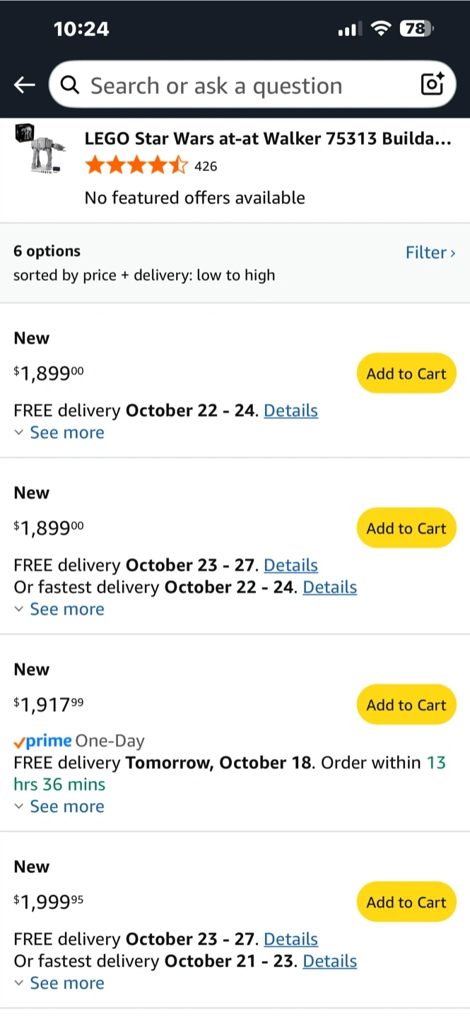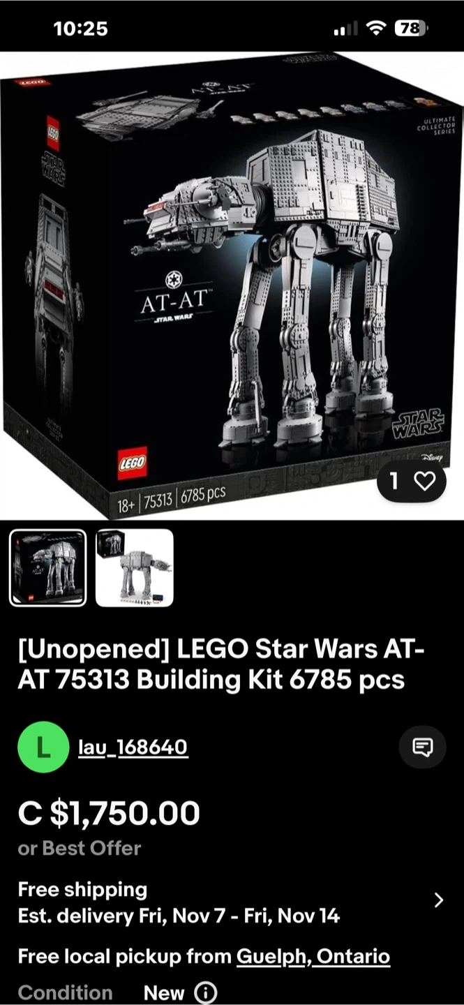 Selling a brand new, unopened LEGO Star Wars AT-AT (75313) from the Ultimate Collector Series! This set contains 6785 pieces and is recommended for ages 18+. It's the perfect gift for any Star Wars or LEGO enthusiast. The box is in great condition and ready for pickup. Please only serious inquiries and offers only.