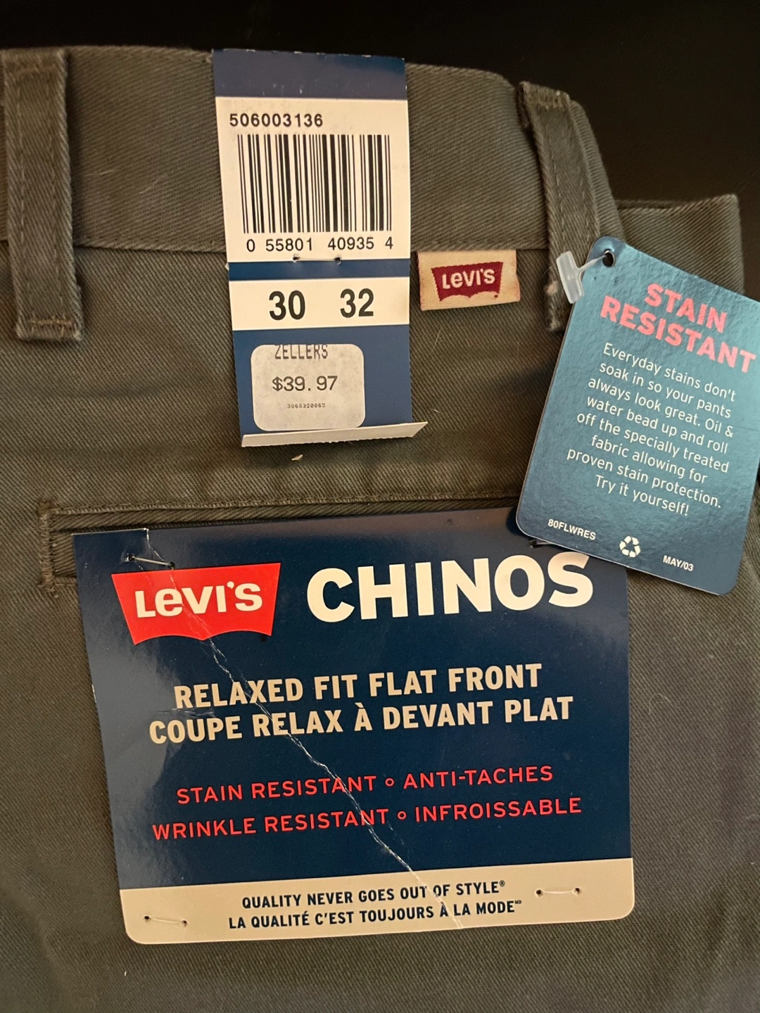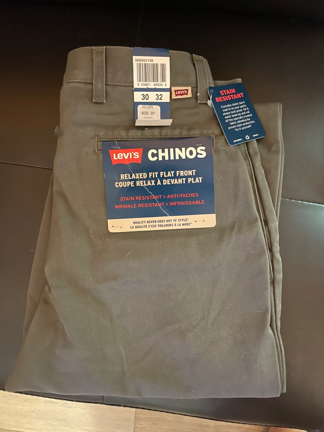 10Brand new with tags Levi's Chinos in size 30x32! These are a relaxed fit with a flat front. They're also stain and wrinkle resistant, perfect for everyday wear. Originally bought for $39.97+tax ($45.17)