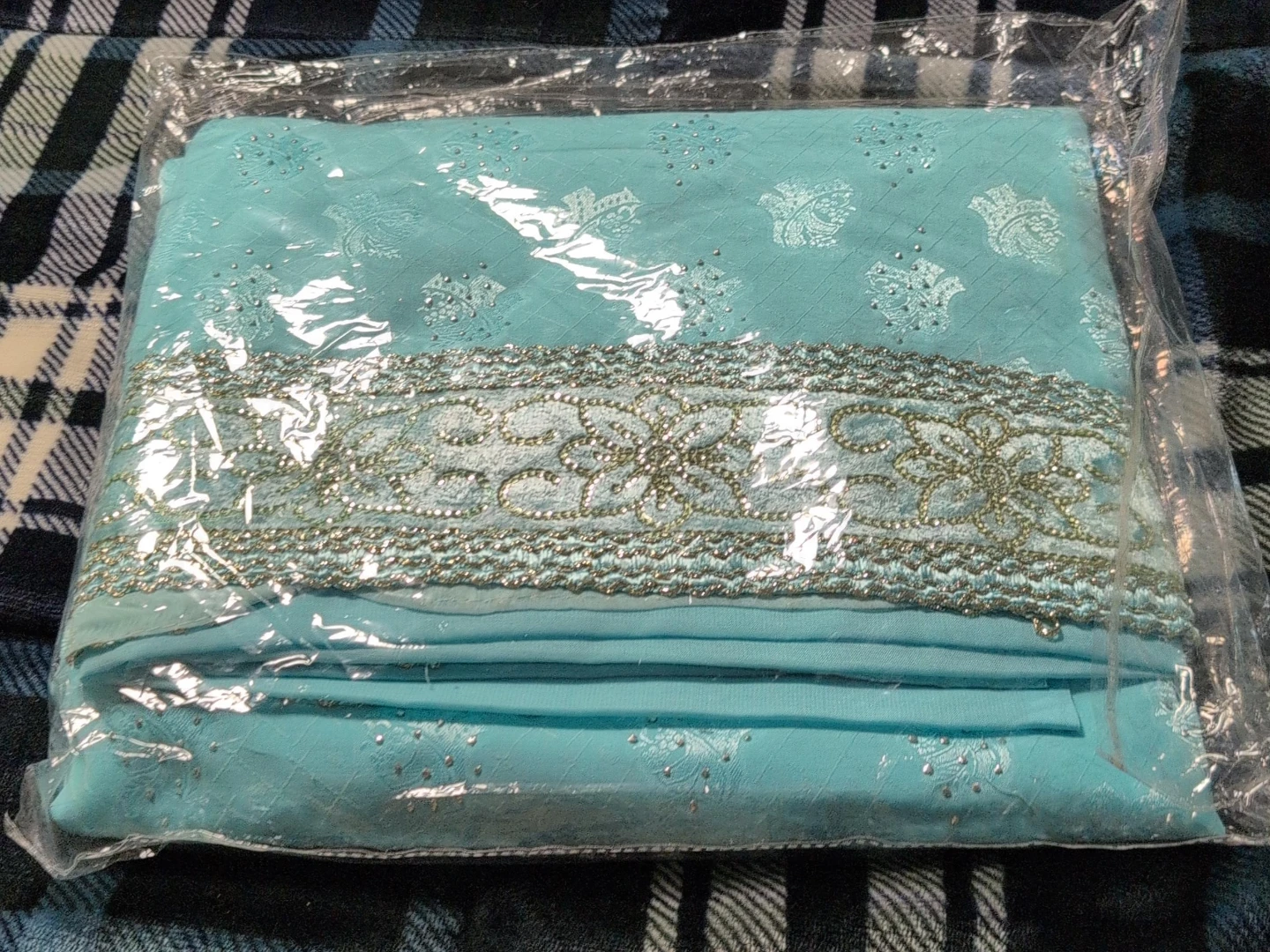 113Brand new saree in a beautiful light blue colour! It features lovely silver embroidery, making it perfect for special occasions or adding a touch of elegance to your wardrobe