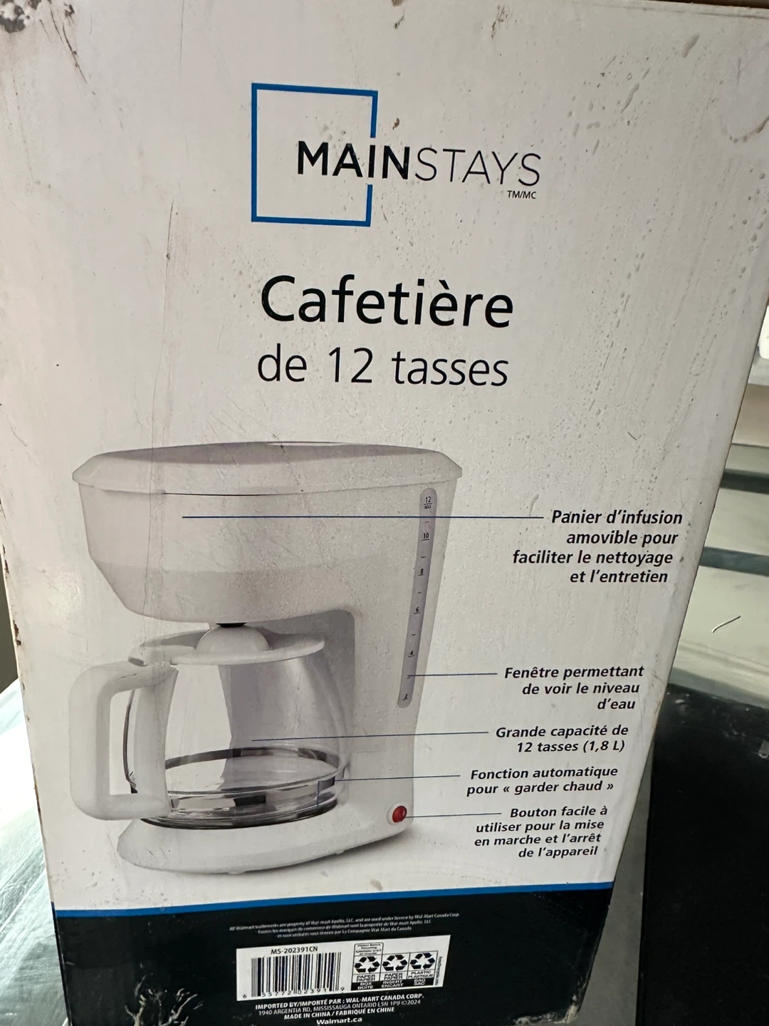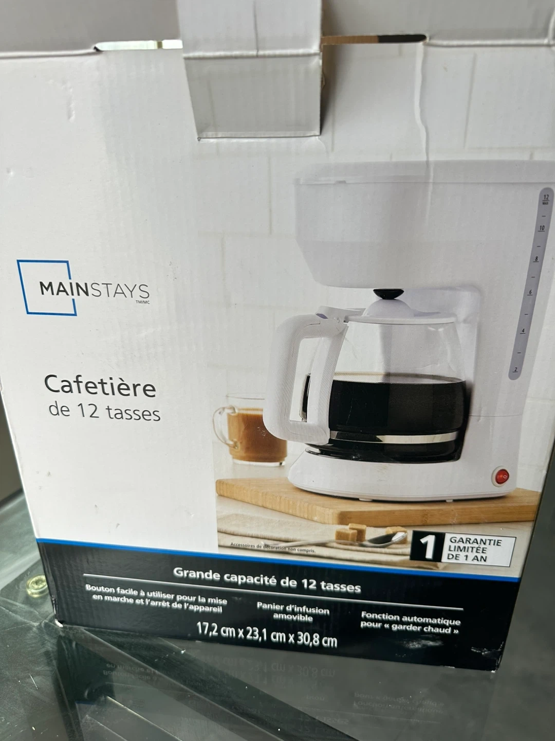 59Selling a brand new Mainstays 12-Cup Coffee Maker! It's still in its original packaging. Key features include: - Large 12-cup capacity (1.8 L) - Removable brew basket for easy cleaning - Water level window - Auto "keep warm" function - Easy power on/off button The box measures approximately 6.8 inches wide x 9.1 inches deep x 12.1 inches high (17.2 cm x 23.1 cm x 30.8 cm)