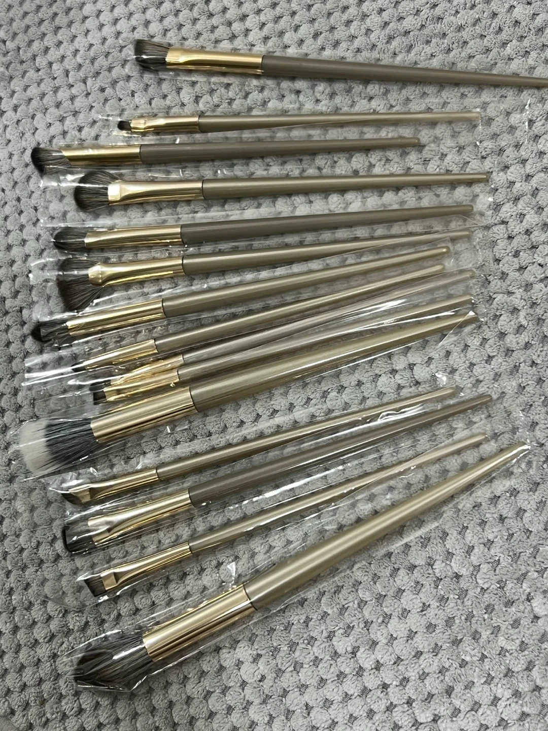 Selling a brand new set of makeup brushes! This set includes 15 brushes with gold and grey handles, still sealed in their original packaging. Perfect for applying all kinds of makeup, from foundation to eyeshadow