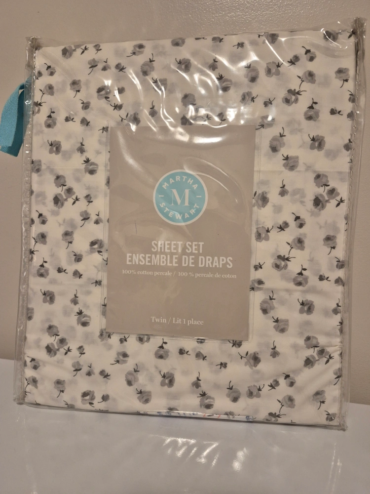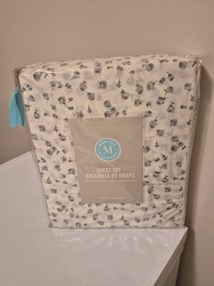 Brand new in packaging Martha Stewart twin sheet set! The set features a pretty rose floral pattern on 100% cotton percale with a 300 thread count! Includes: - 1 flat sheet: 66in x 96in - 1 fitted sheet: 39in x 75in x 15in - 1 standard pillowcase: 20in x 30in Perfect for adding a touch of spring/fall to your bedroom! See last two pictures for a price comparison! Curbside pickup M-Sat 5pm-10pm. Or Delivery within London for an extra $5!