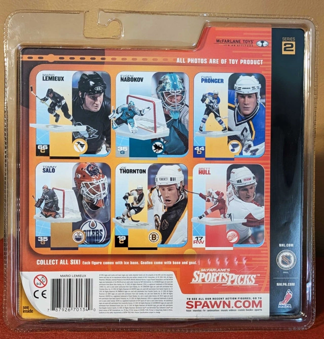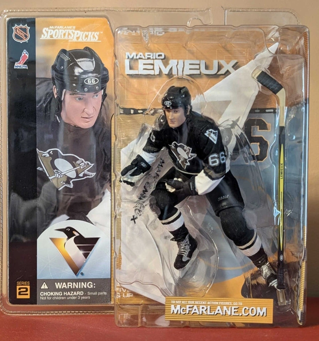 If you are seeing this Ad, then this item is still available This sale is for 1 very nice and clean NEW - McFarlane - NHL Series 2 - Mario Lemieux - Pittsburgh Penguins (Black Jersey Variant) Action Figure. The McFarlane NHL Series 2 - Mario Lemieux - Pittsburgh Penguins (Black Jersey Variant) was released in January 2002. This collectible captures Mario Lemieux in his signature skating pose, wearing the black Pittsburgh Penguins jersey, which was a chase variant—making it rarer than the standard white jersey version. Key Features: • Highly detailed sculpt replicating Lemieux’s playing style • Black Pittsburgh Penguins jersey variant, a sought-after collectible • 6-inch scale with realistic equipment details. • Limited availability, making it a prized item for collectors. Pick-up in Pickering ONLY This item comes from a smoke-free home.