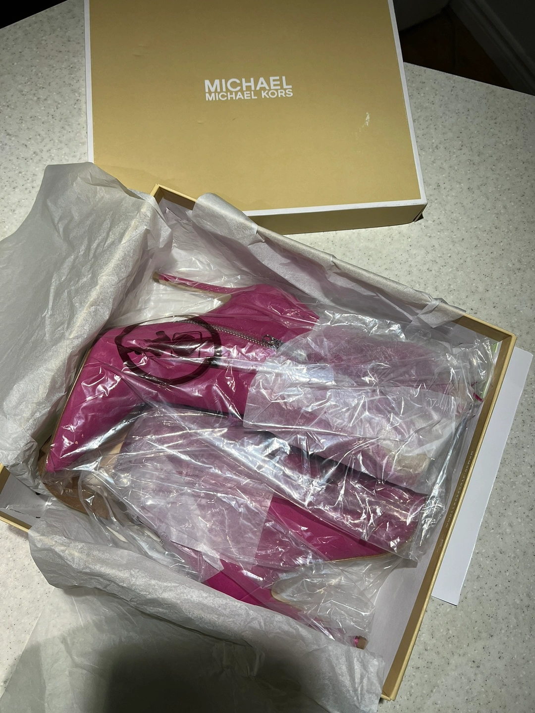 331Michael Kors Brand New Fuchsia Boots 7.5; These boots are suede and feature a feather trim. They are a deep fuchsia colour. The boots have a stiletto heel.