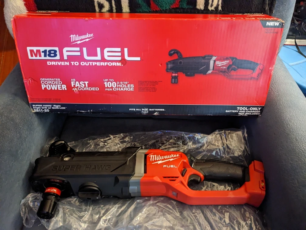 15Selling a brand new Milwaukee M18 FUEL SUPER HAWG Right Angle Drill with QUIK-LOK (2811-20). It generates corded power and is as fast as corded. You can get up to 100 2-9/16" holes per charge. Tool only, battery and charger are not included. The box is included!