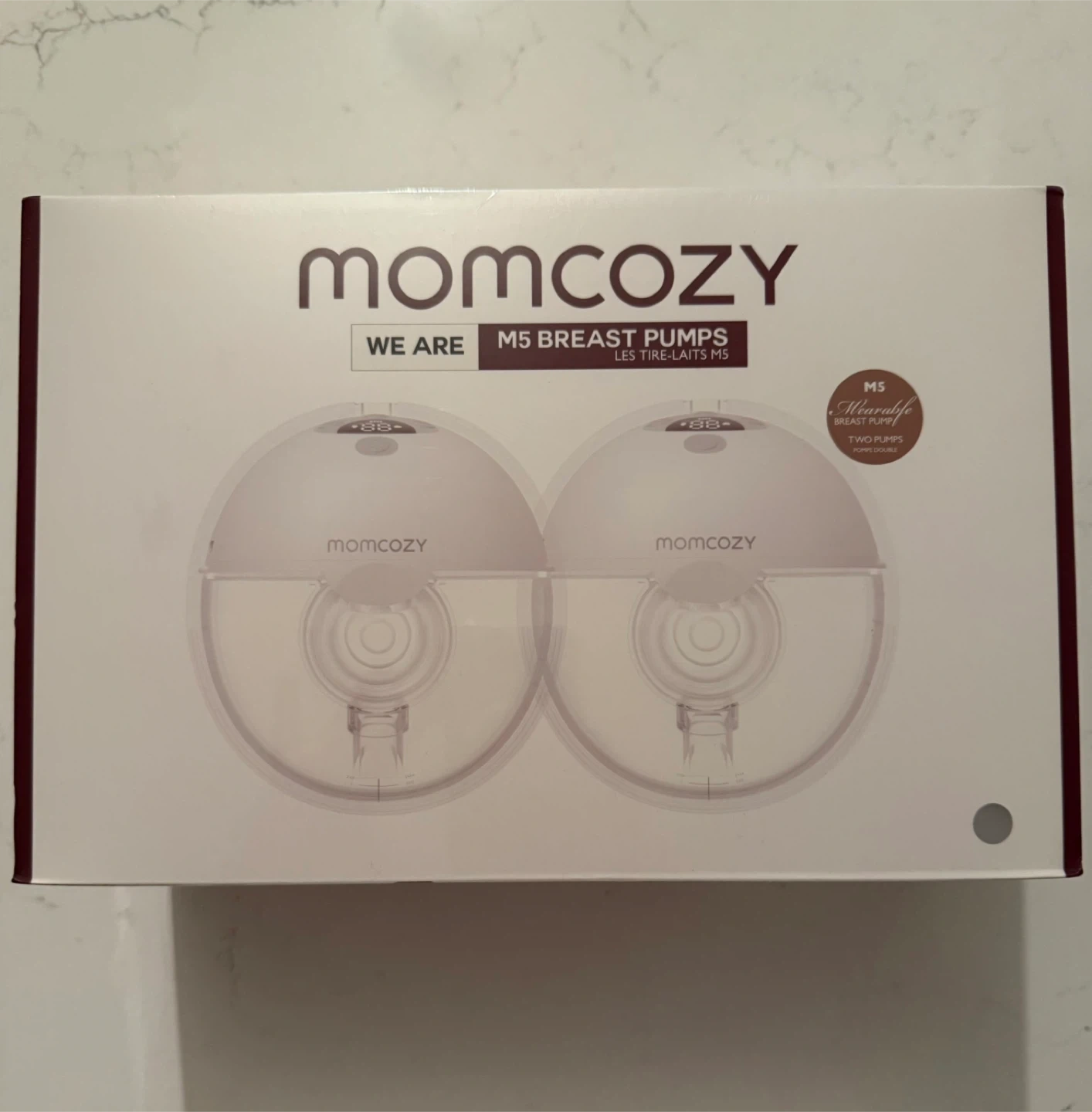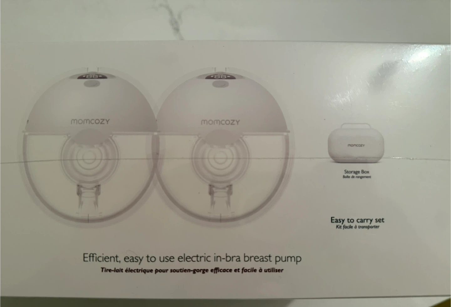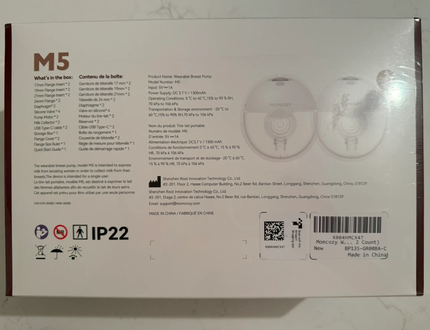 Selling a brand new Momcozy M5 Wearable Breast Pump! This is a double pump set, perfect for efficient and easy milk expression. The box includes: - 17mm Flange Insert x2 - 19mm Flange Insert x2 - 21mm Flange Insert x2 - 24mm Flange x2 - Diaphragm x2 - Silicone Valve x4 - Pump Motor x2 - Linker x2 - USB Type-C cable x2 - Storage Box x1 - Flange Cover x2 - Flange Adjuster x2 - Quick Start Guide x1 It's an efficient, easy-to-use electric in-bra breast pump. The model number is M5. Input: 5V 1A. Power Supply: DC 3.7 V / 1300mAh