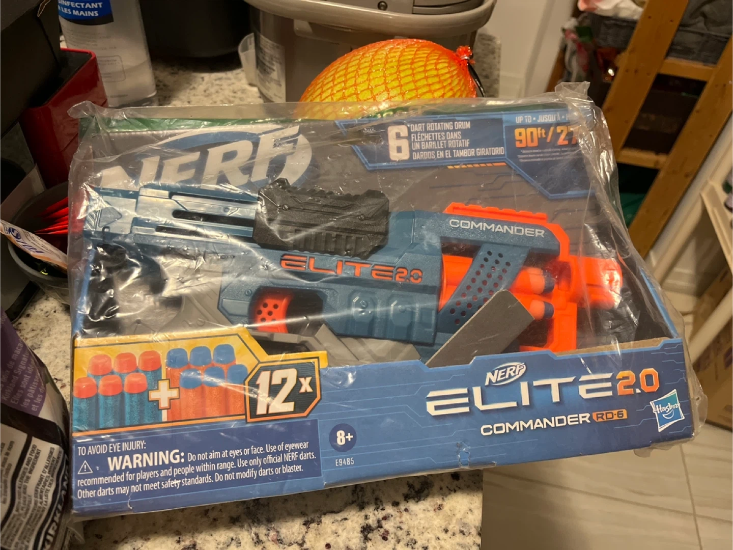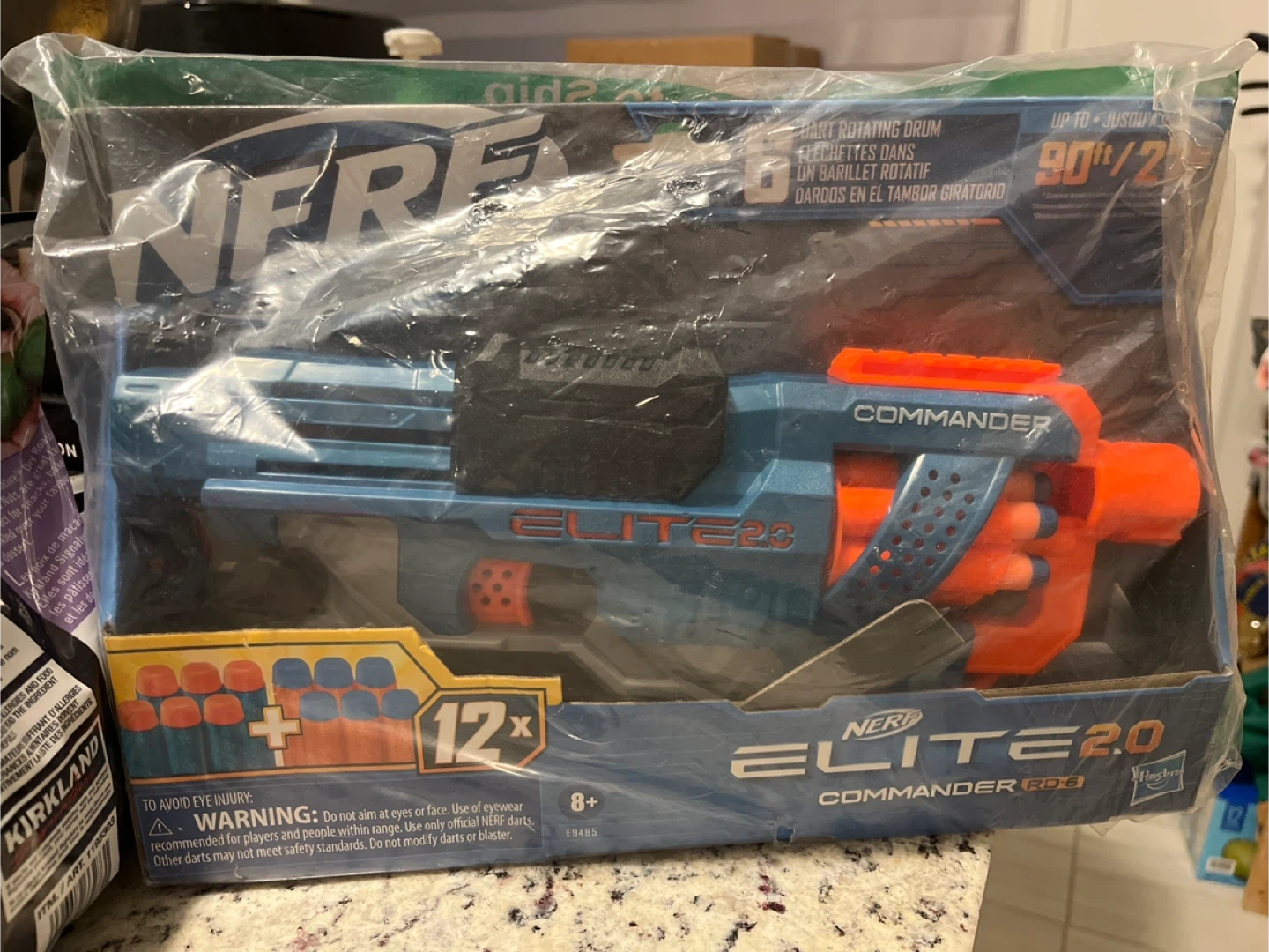 Selling a brand new Nerf Elite 2.0 Commander RD-6 blaster! It comes with 12 darts and has tactical rails for customization. The packaging says it's suitable for ages 8 and up. Hours of fun! Never opened before, in original packaging Retail: $24