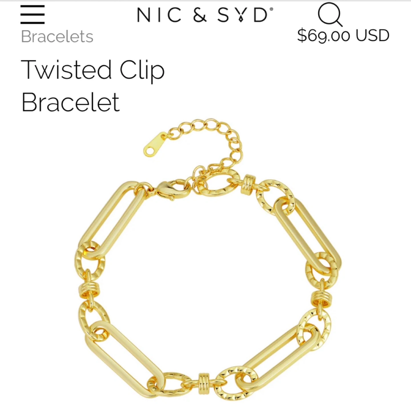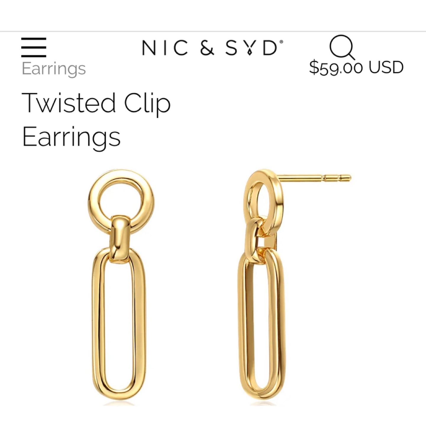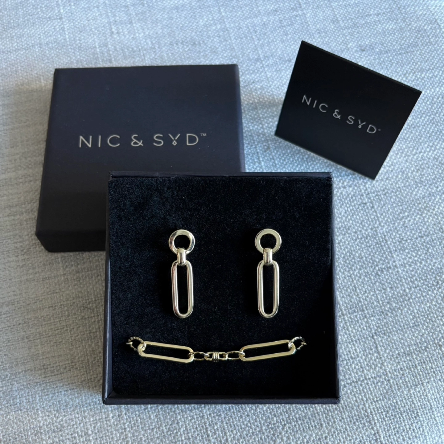 Brand new in box! Comes in gift box, ready for gifting. Elegant paperclip gold earrings and bracelet set by Nic & Syd. Perfect for any occasion. Twisted Clip Bracelet (retail $69 USD) Twisted Clip Earrings (retail $59 USD) This bracelet puts a "twist" on the regular paper clip bracelet with alternating twisted clips, elevating the design. The drop paperclip earrings are the perfect pairing for any paper clip inspired necklace Material: Brass with gold plating. Dimensions: Bracelet length is approximately 7 inches with a 1-inch extension. Earring length is approx. 1 1/4 inches.