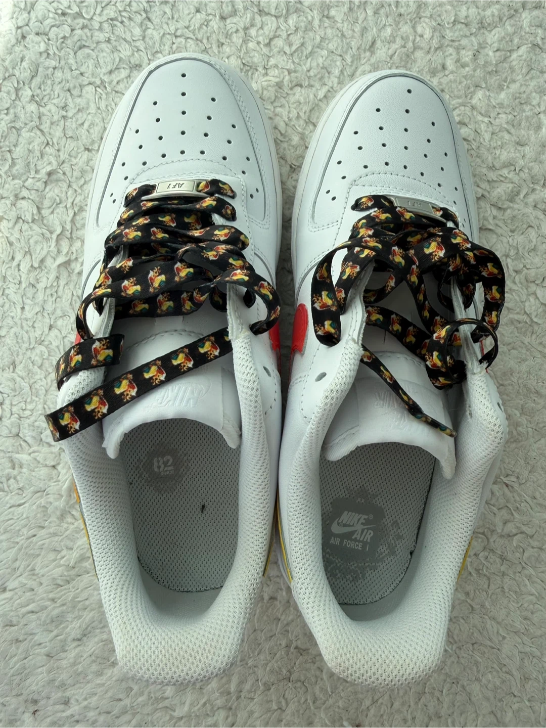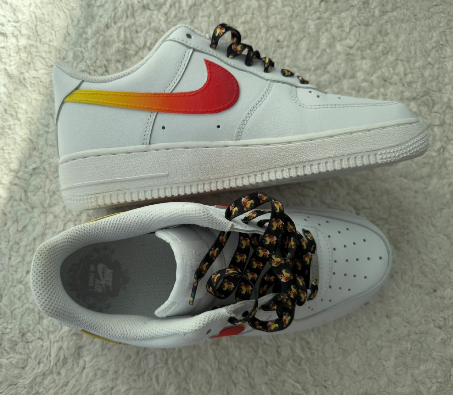 60Selling a pair of Nike Air Force 1 sneakers in white with custom! They feature a red and yellow swoosh and unique patterned laces. These are a stylish addition to any wardrobe! Completely new. Never worn. Size US 8