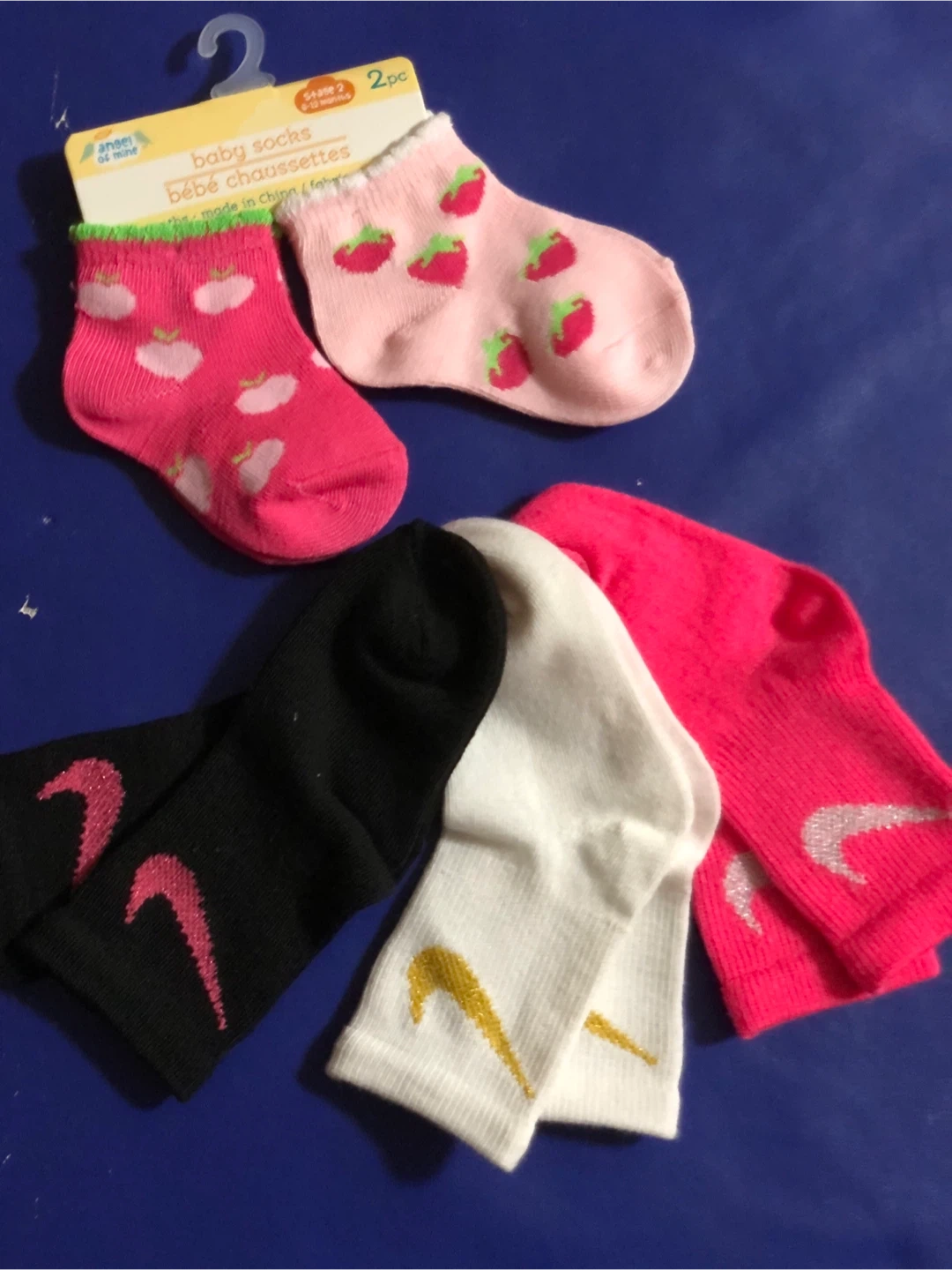 A bundle of adorable baby socks! You'll get a mix of Nike socks in black, white, and pink, plus a pair of Angel of Mine baby socks with a cute strawberry pattern