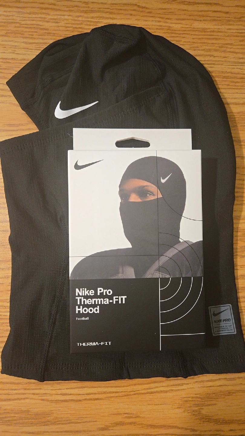 20Selling a brand new Nike Pro Therma-FIT hood, perfect for football or any outdoor activity! It's designed to keep you warm and comfortable in cold weather conditions. The Therma-FIT technology helps manage your body’s natural heat to keep you warm. It's black and in excellent condition, ready for its next adventure