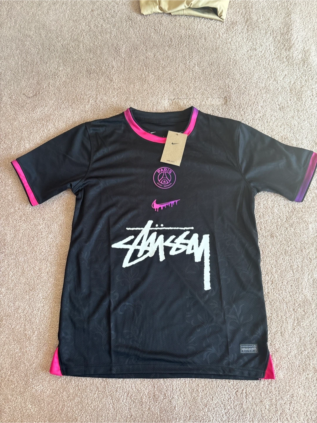 Selling a brand new Nike x Stussy Paris Saint-Germain jersey! This stylish black jersey features the iconic PSG logo with a unique Stussy twist. It's a size small and perfect for any fan of fashion or football. The Dri-FIT technology ensures you stay comfortable whether you're on the pitch or just out and about. Grab this limited edition piece while you can!