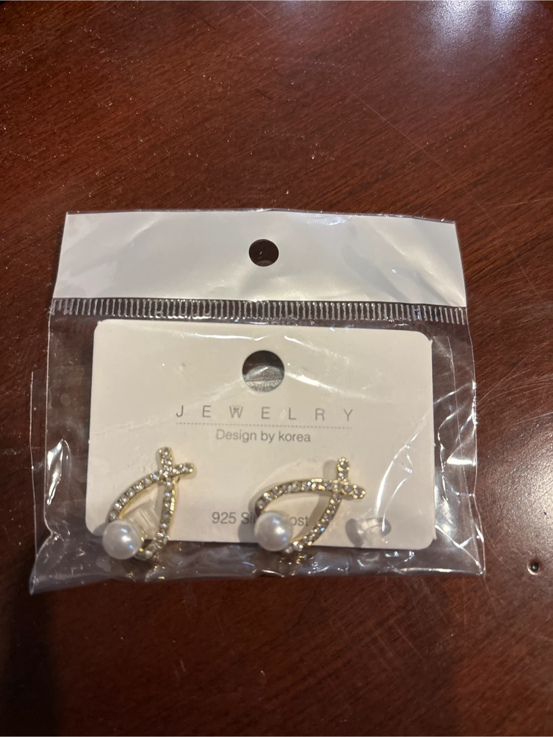 108Brand new earrings with a unique design from Korea! These earrings feature a gold-tone setting with a pearl accent. They are in perfect condition and still in their original packaging