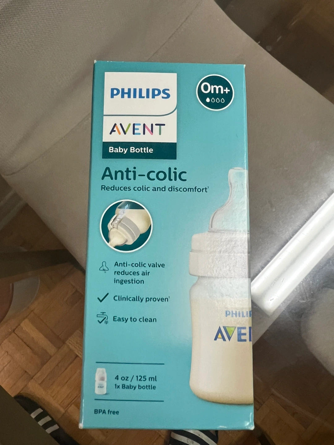 I'm selling a brand new Philips Avent anti-colic baby bottle. It's 4 oz/125 ml and BPA free. It's designed to reduce colic and discomfort with its anti-colic valve that reduces air ingestion. It's also clinically proven and easy to clean! Great for babies 0m+
