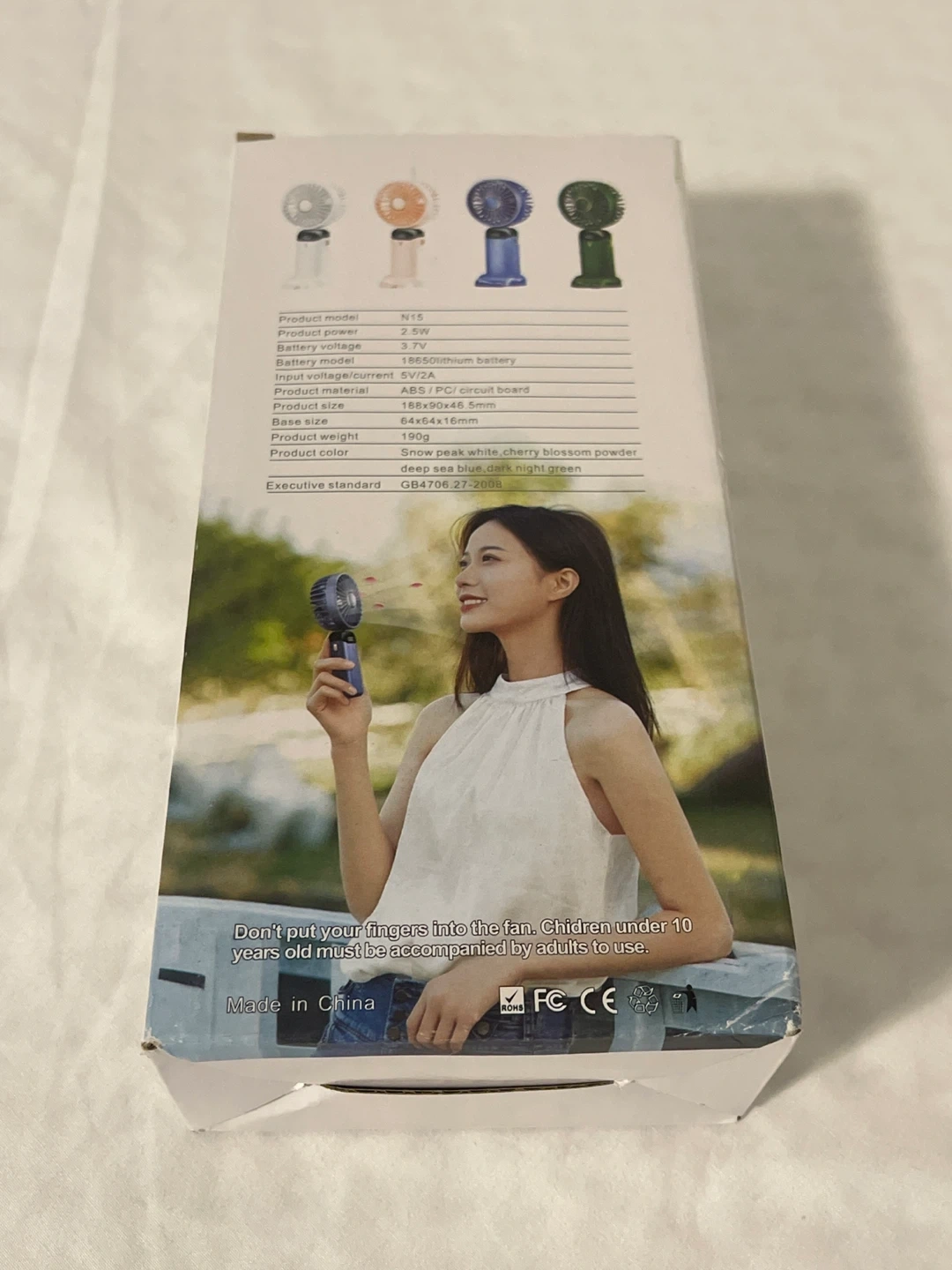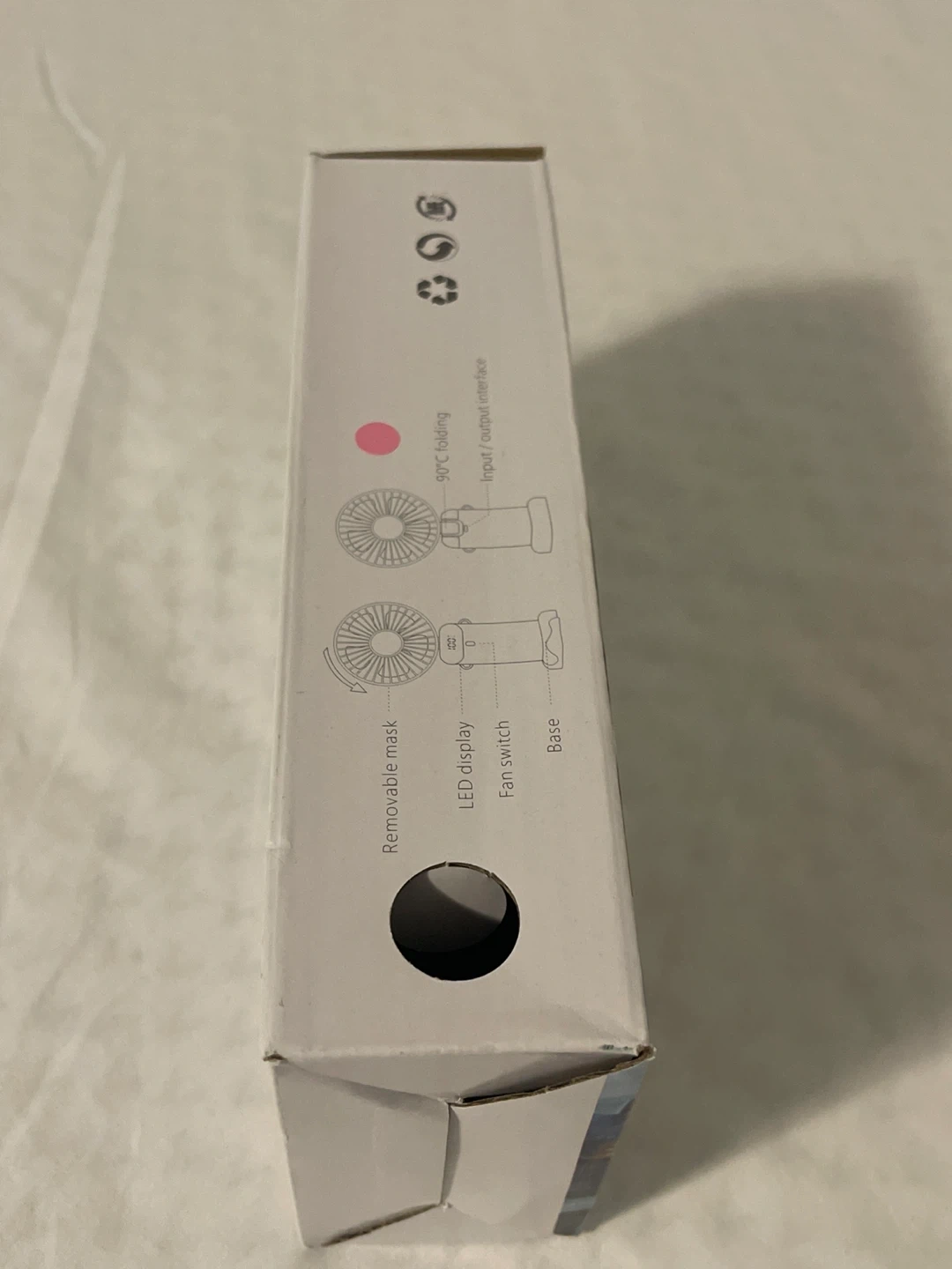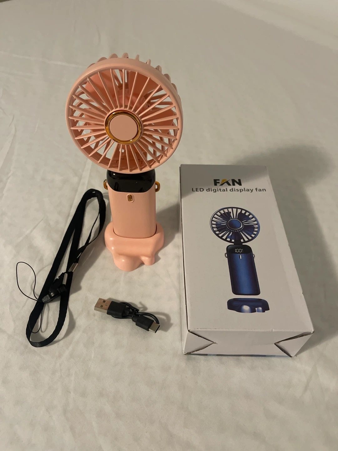 This is a new LED digital display fan in pink! It features: - LED display - Real-time power - 5th gear intelligent settings - Long endurance Comes with the box and a charging cable