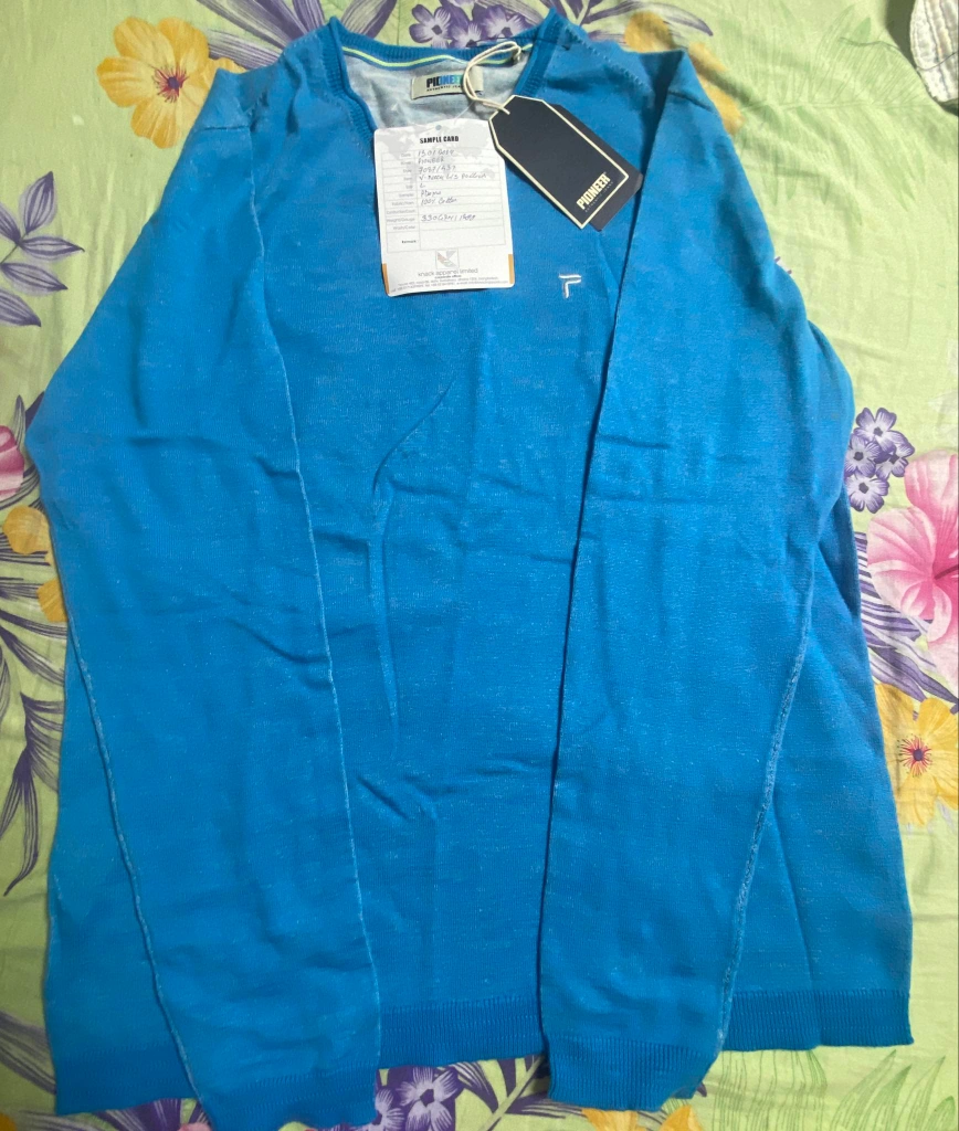 246Here's a Pioneer short-sleeve sweater in a lovely shade of blue! It's a great piece for layering or wearing on its own during those in-between weather days. The material feels soft and comfortable, perfect for everyday wear. it's brand new with tags.