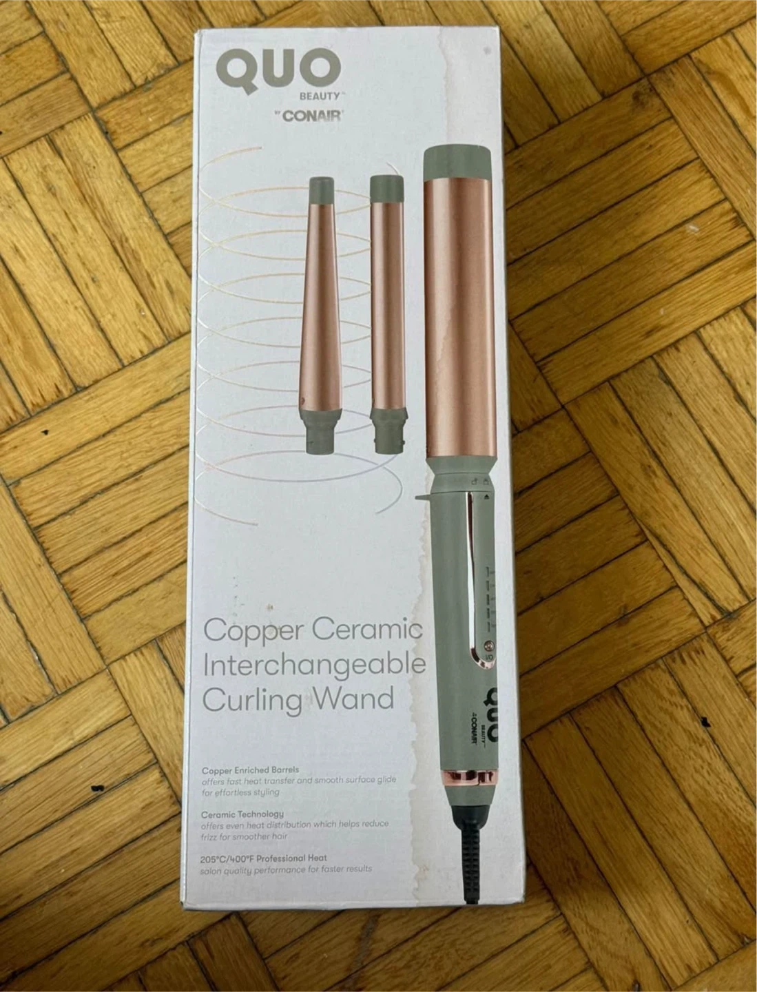 I'm selling a brand new Quo Beauty Copper Ceramic Interchangeable Curling Wand! It features copper enriched barrels for effortless styling and smooth surface glide. It also has ceramic technology which helps reduce frizz for smoother hair. It heats up to 205°C/400°F professional heat for salon quality performance for faster results