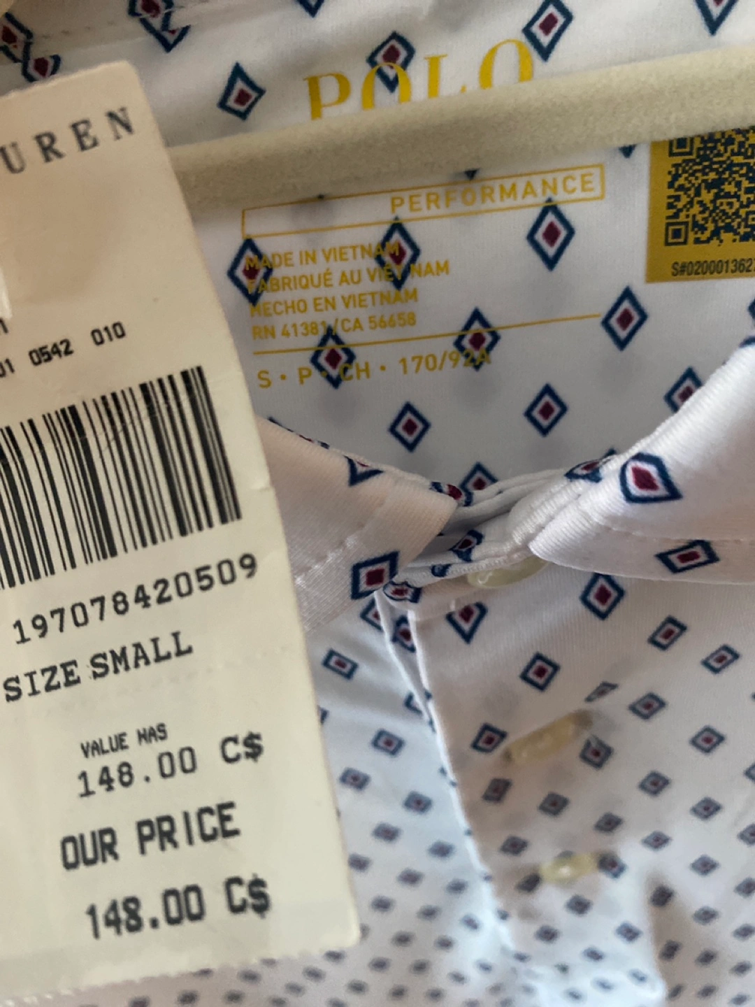 43I have a brand new, never worn, Ralph Lauren Polo Performance shirt for sale! It's a size small and features a stylish diamond pattern. The original price was $148 CAD+ tax but selling at a discount, so you're getting a great deal!