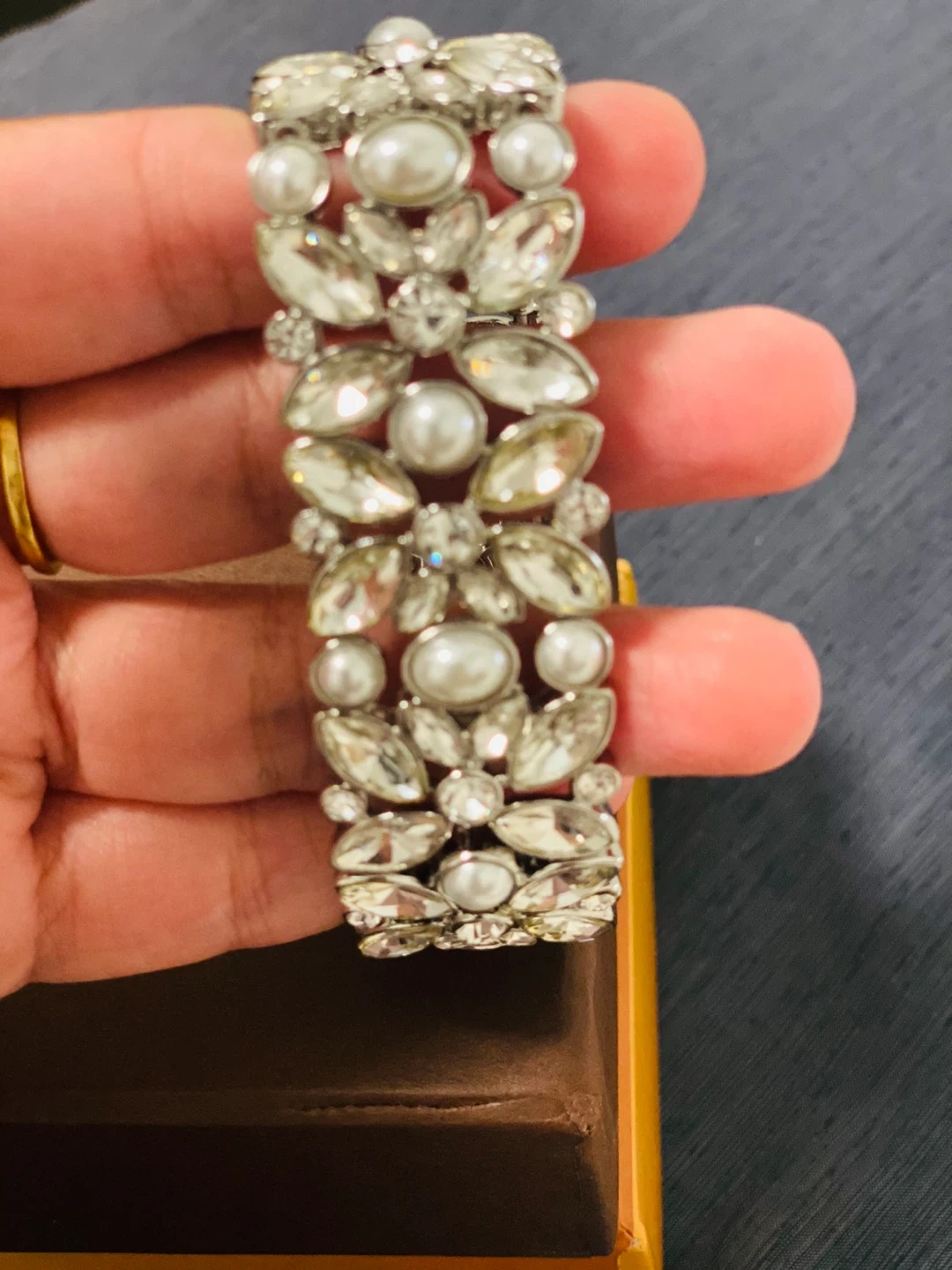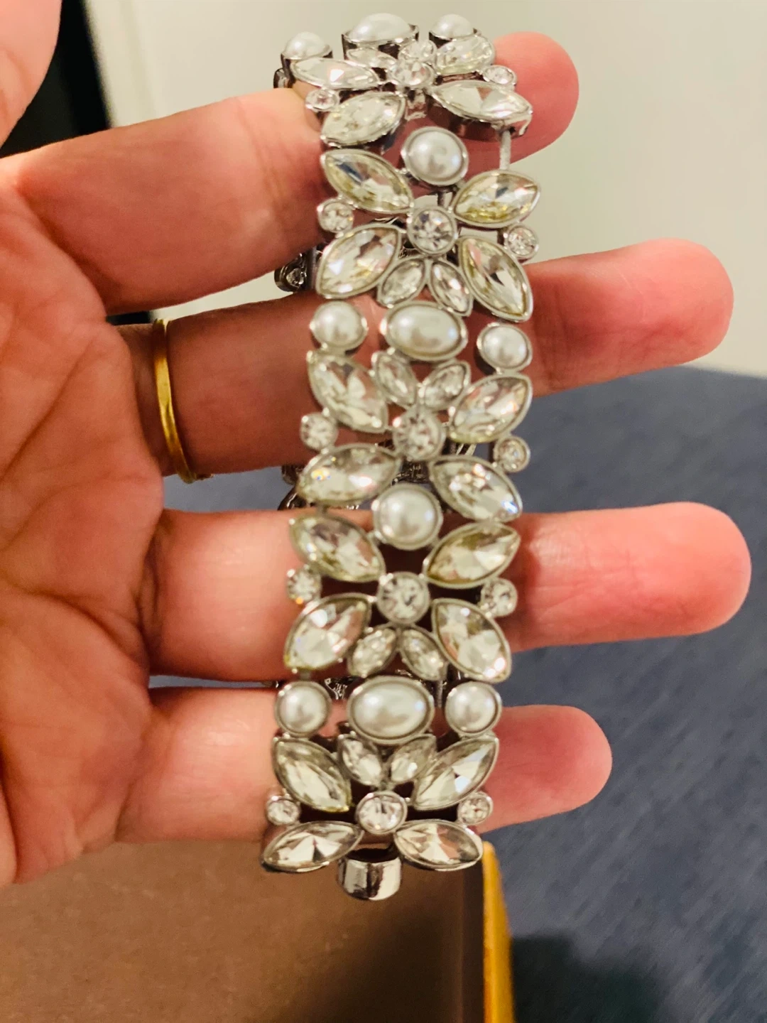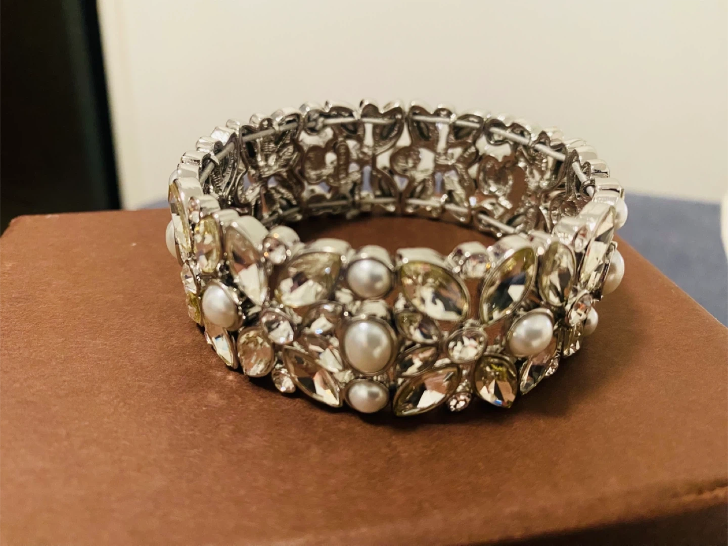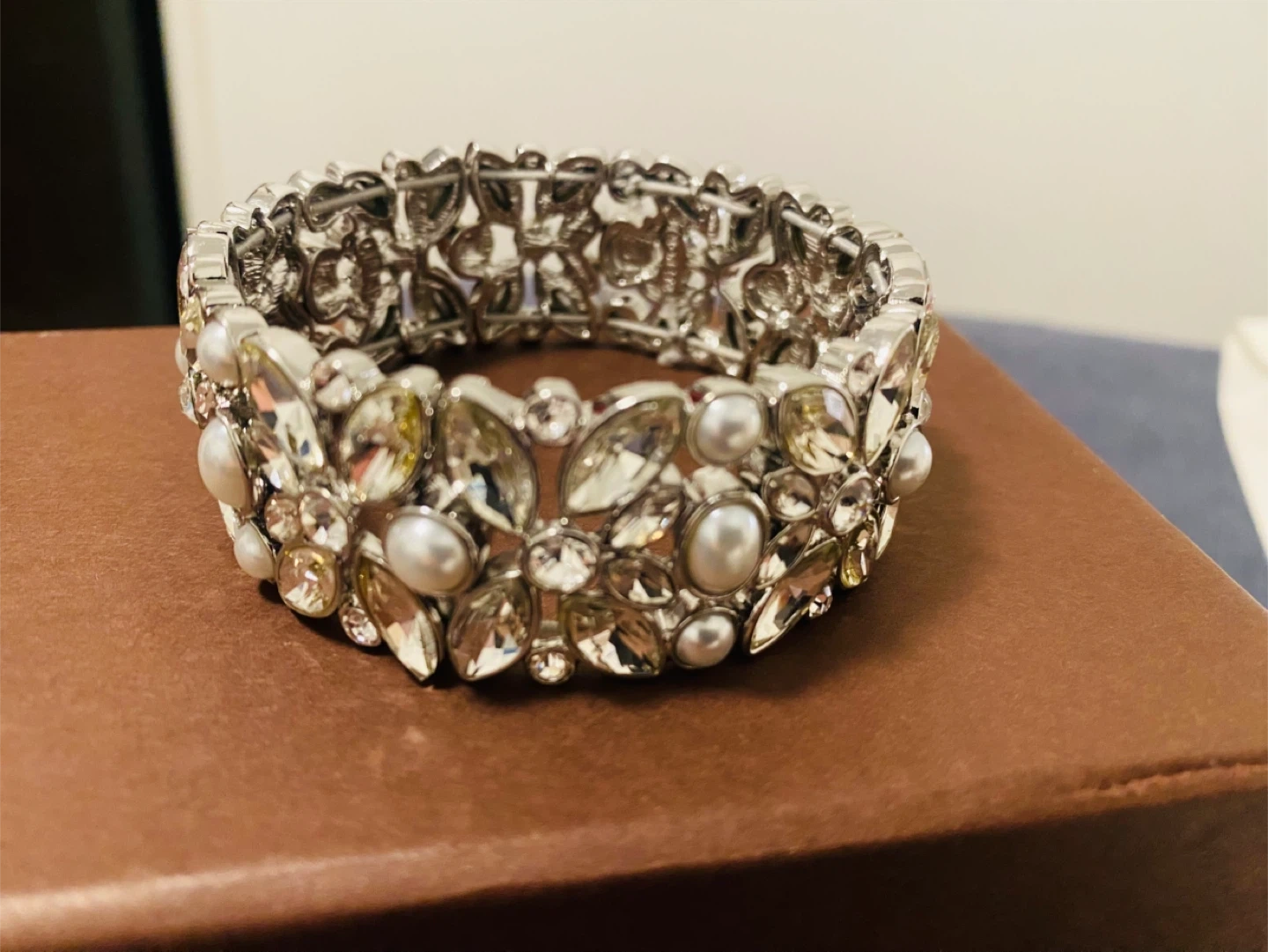 This is a beautiful stretch bracelet featuring rhinestones and pearls. It's in great condition and would make a lovely addition to any outfit! Cash only