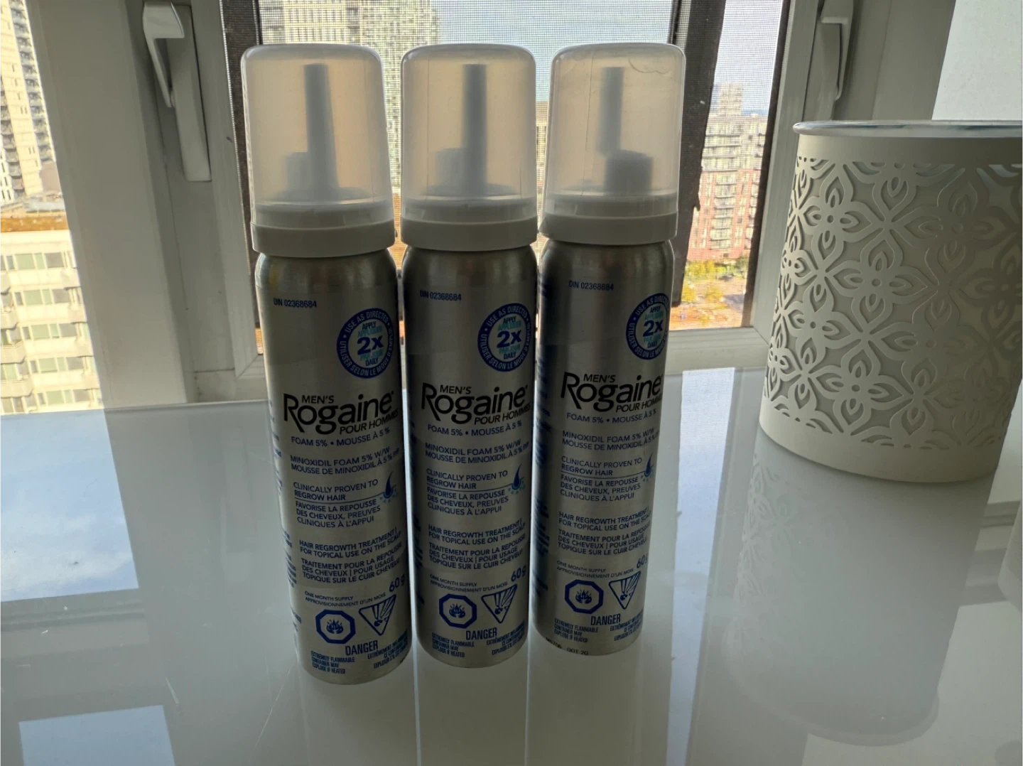 Selling three cans of Men's Rogaine Foam 5% Minoxidil. It's a hair regrowth treatment. Expiration Date: 2026/03