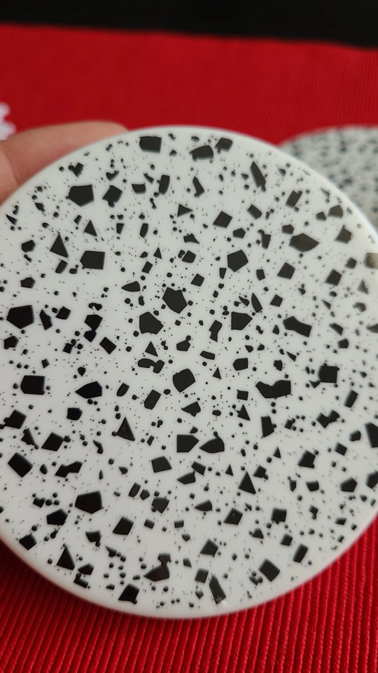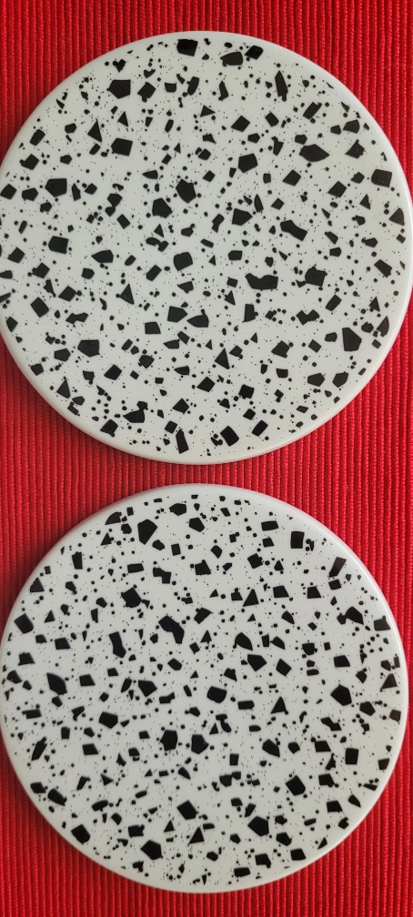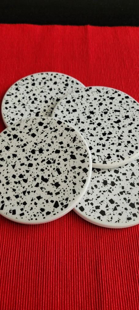 Selling a set of 4 coasters with a terrazzo pattern. They're perfect for adding a stylish touch to your coffee table or desk. The coasters feature a white background with black flecks, giving them a modern and chic look Cork back Yonge and Finch area