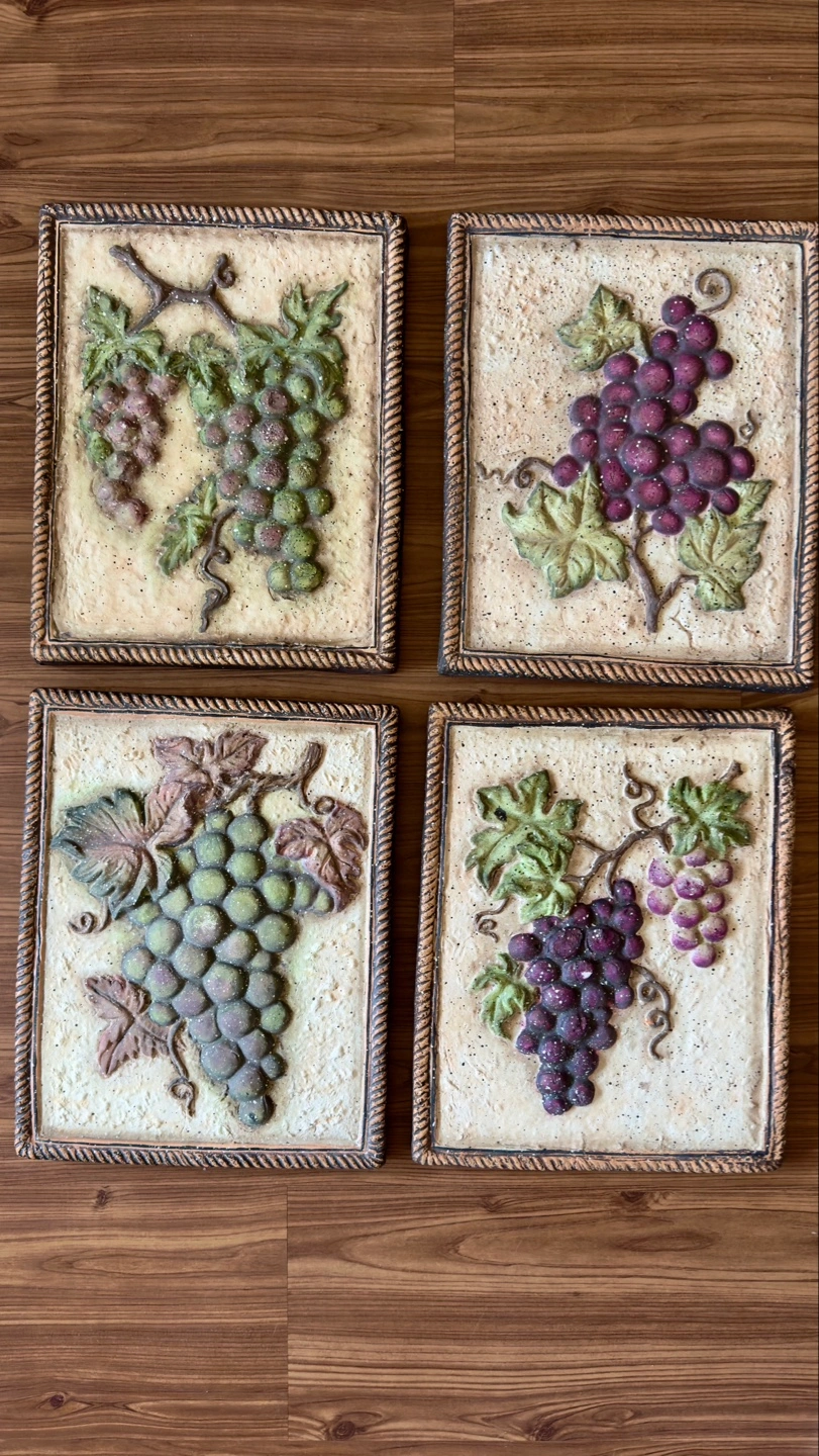 NEW Four decorative wall plaques. Each features a cluster of grapes on a vine. Beige background with brown frame. Excellent for kitchen or dining room. $ 30 for all! Only available for pick up