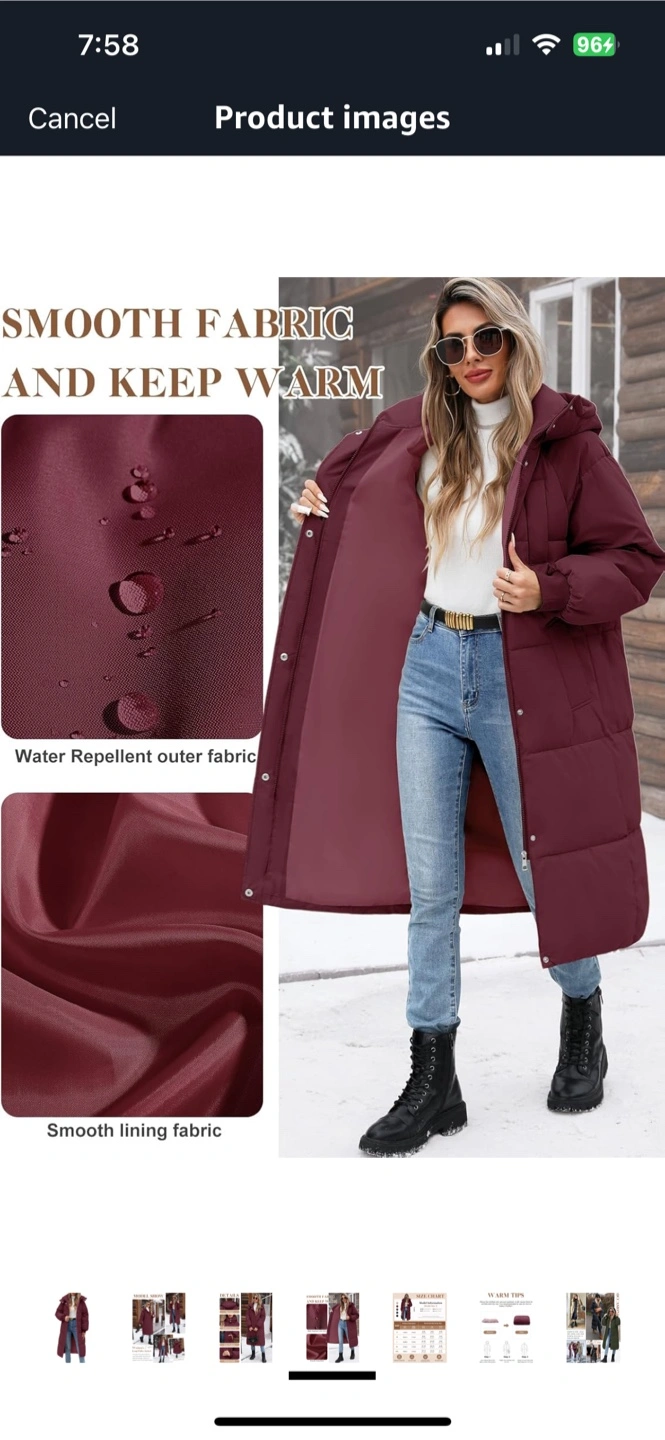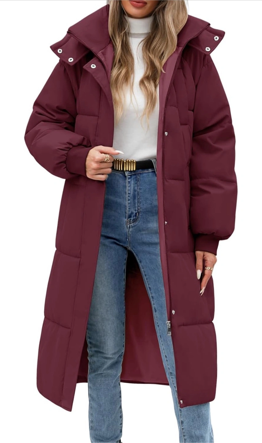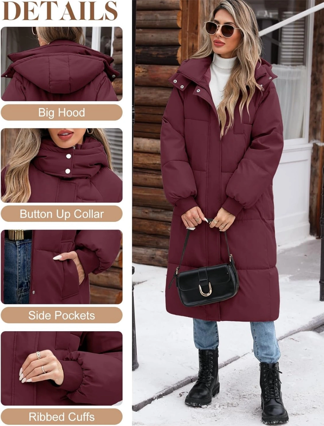 New! This warm jacket features a maxi-length design that offers both style and coverage, making it an elegant choice for cold weather fashion It has: - A big hood - Button up collar - Side pockets - Ribbed cuffs 【Winter Coats For Women】Womens winter coats are made of 100% polyester and padded with premium polyester, exuding a plump and puffy charm, buttery softness. Ladies winter coats with excellent thermal insulation can keep you toasty, snug and comfortable in cold, snow, rainy days. 【Features of Womens Coats】Winter jacket for women are designed with full-zipper for convenient wear. Two functional side pockets not only offer a convenient space for safeguarding your essentials like keys, cards, and phone, but also warm your hands ensuring warmth. A decorative pocket on the chest. Winter coat woman is crafted in a knee length and loose-fitting design.