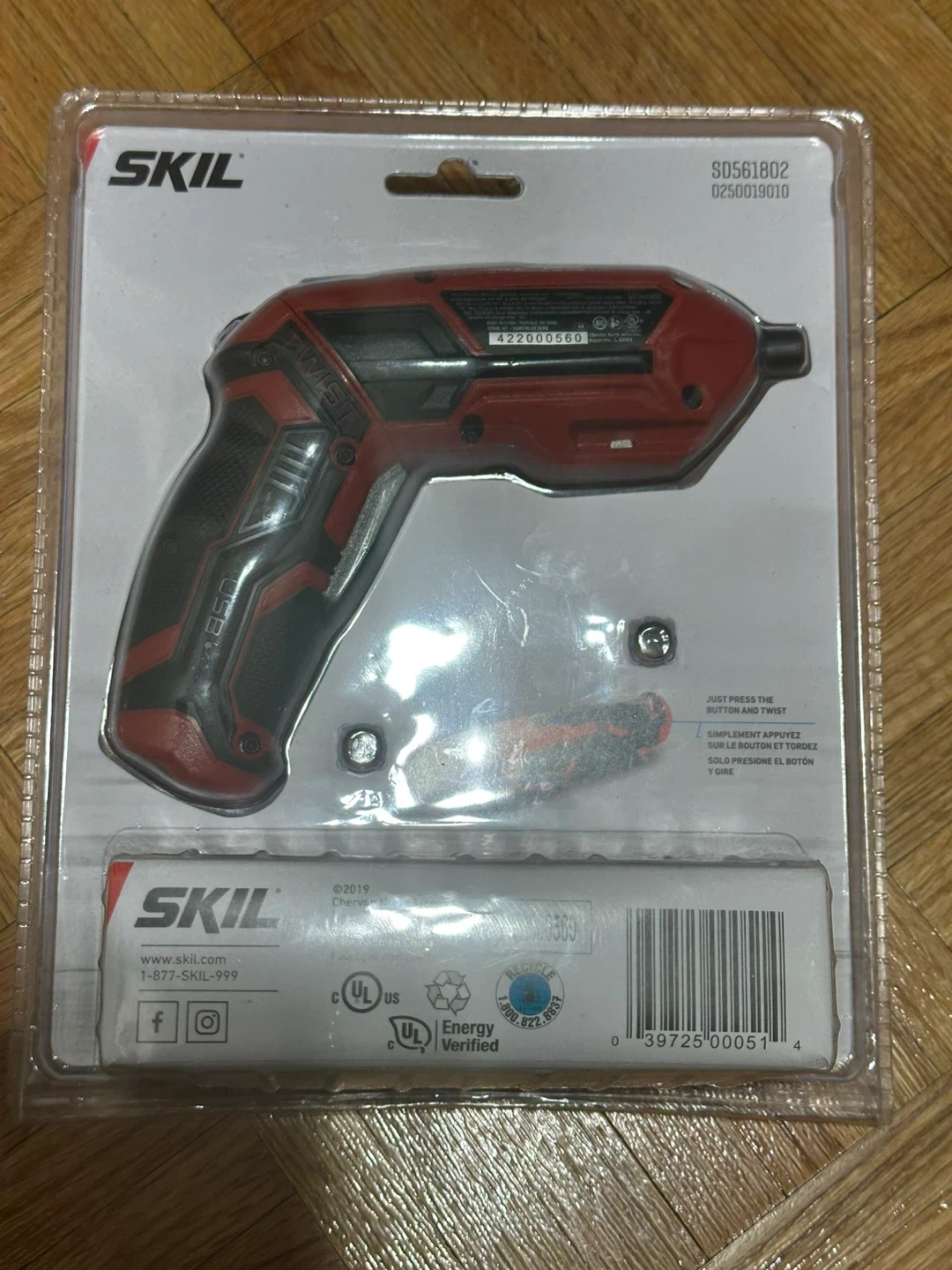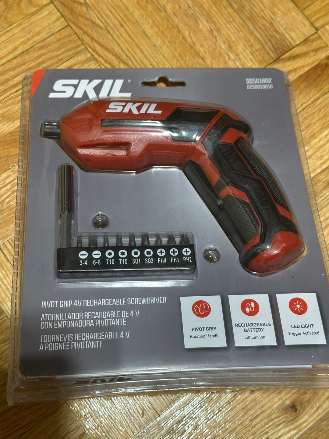 52Selling a brand new Skil Pivot Grip 4V Rechargeable Screwdriver! It features a rotating handle for a comfortable grip, a rechargeable Lithium Ion battery, and an LED light that's triggered by the trigger. The screwdriver comes with various bits to handle different screw types. It's ready to help with all your small projects around the house