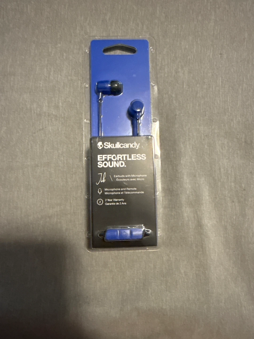 12Selling a brand new pair of Skullcandy Jib earbuds! They come in their original packaging and are a nice blue colour. These earbuds have a microphone and remote, perfect for taking calls or listening to music on the go!