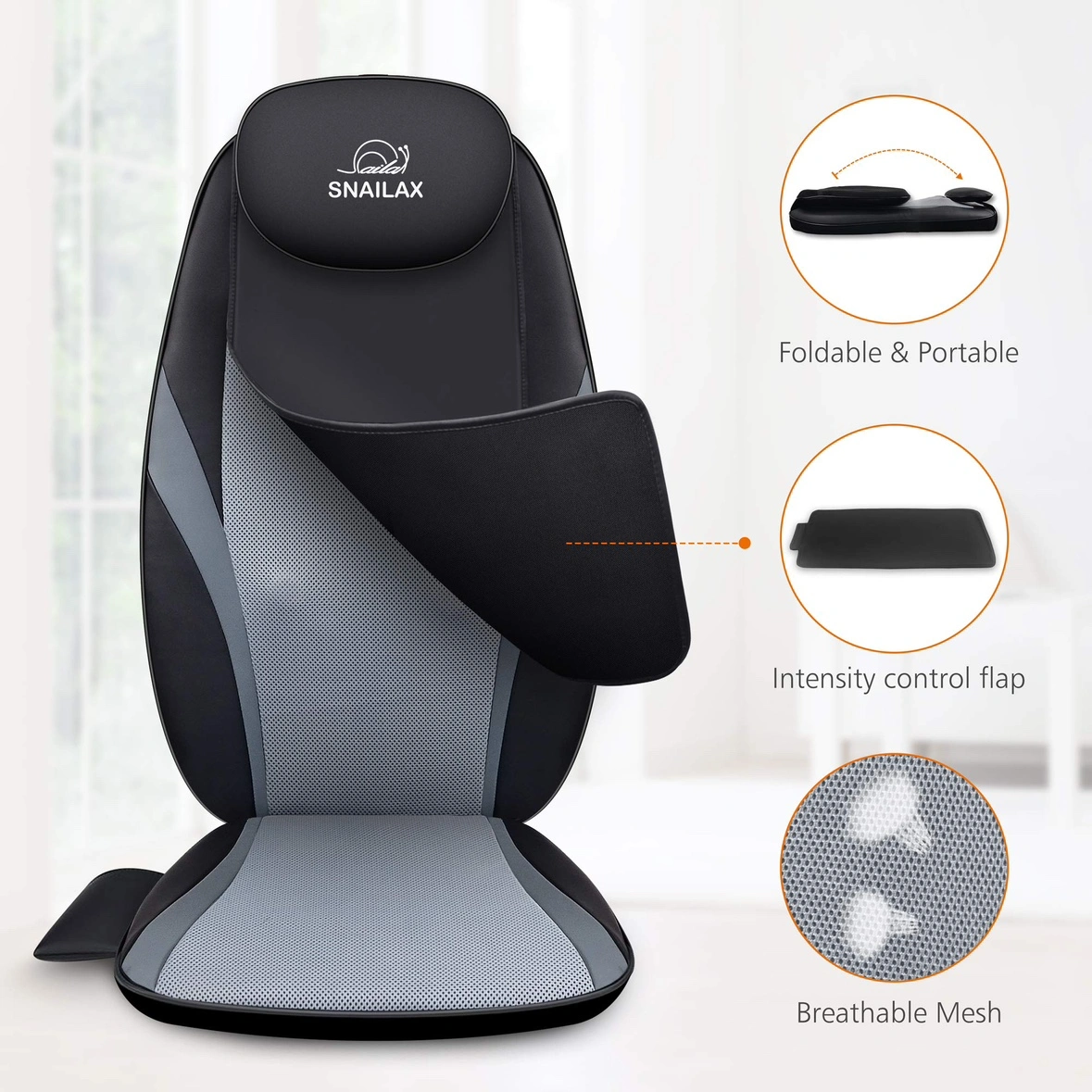 Use for Back Power source Corded Electric(12V) Material Leather Item weight 2.6 Kilograms Brand Snailax Colour Grey and Black 4 deep kneading massage nodes travel up and down relaxing your entire back. 3 massage massage zones for your choices: full back, upper back, lower back The massage nodes are adjustable at max. Height of 3mm to fit the curves of the body for more comfortable massage experience Vibration seat massager: vibration on seat with adjustable 3 levels intensity, provides you a comfortable massage to hip and thighs.(Note: on the Sitting area there is only vibration massage, no heat) Soothing heat therapy: It warms your back while relaxing tense muscles across your entire back, lumbar and shoulders Use this back massager on a sofa, couch, recliner, office chair or dinning chair to make the ultimate comfort seat in the house. The integrated strapping system secures it on chairs in place. Volts: 110v