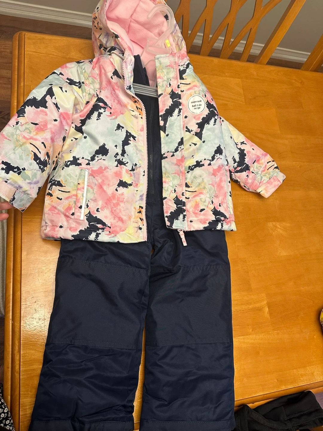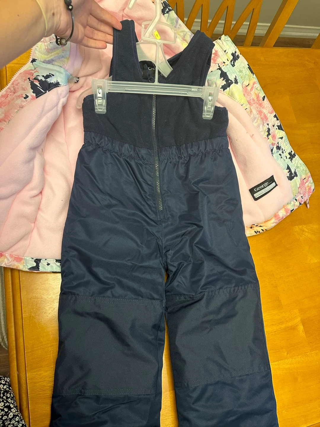 Keep your little one warm this winter with this adorable George snowsuit set! It features a colourful printed jacket and navy blue snow pants, perfect for playing in the snow. The set is in great condition and ready for a new home