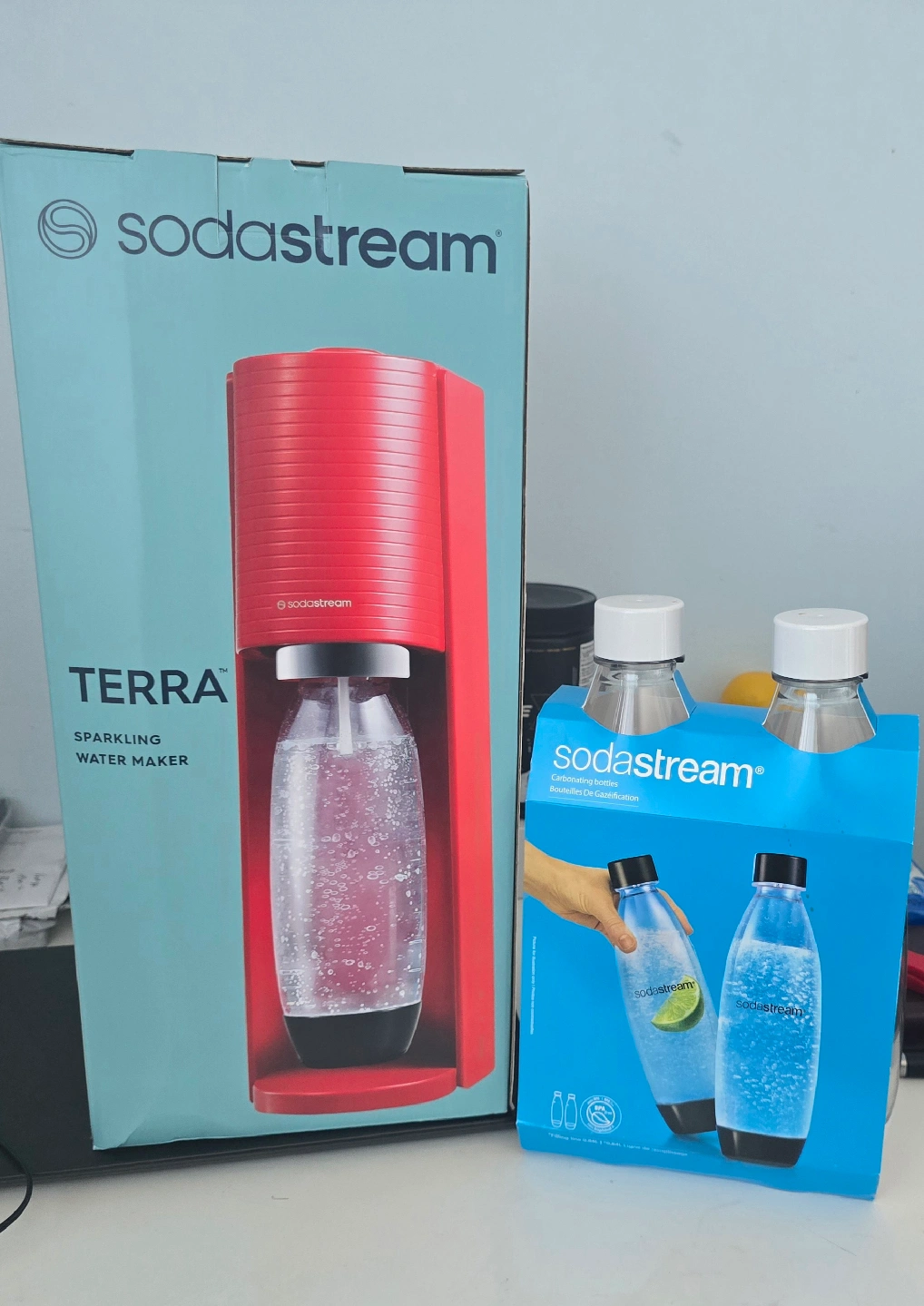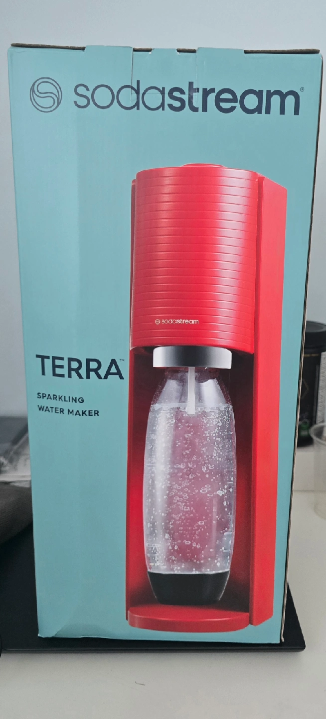 60Selling a brand new SodaStream Terra sparkling water maker in red! It comes with the box and all included components. This is a great way to make sparkling water at home. Enjoy!
