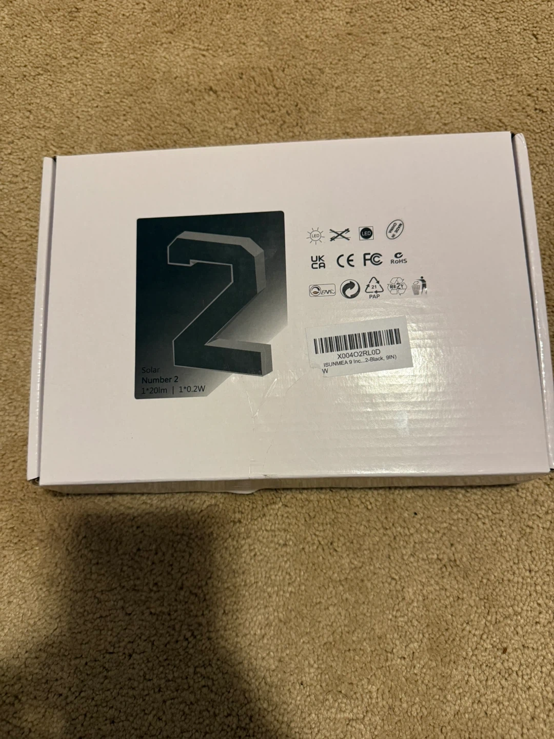 Selling a brand new solar-powered LED number 2 light! It's black and about 9 inches tall. The box says it's 1*20lm and 1*0.2W. Perfect for adding a unique touch to your home or garden lighting