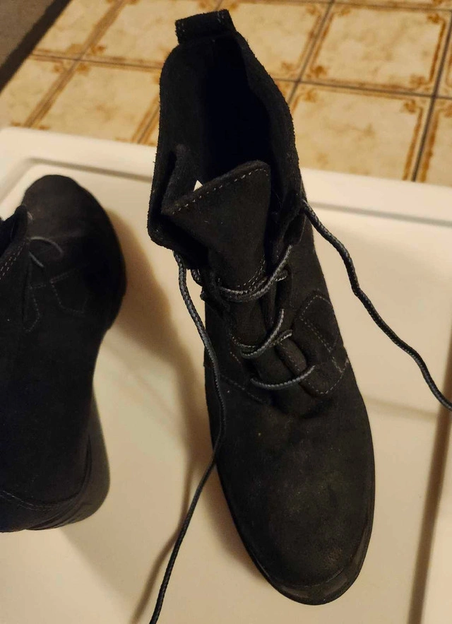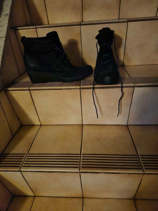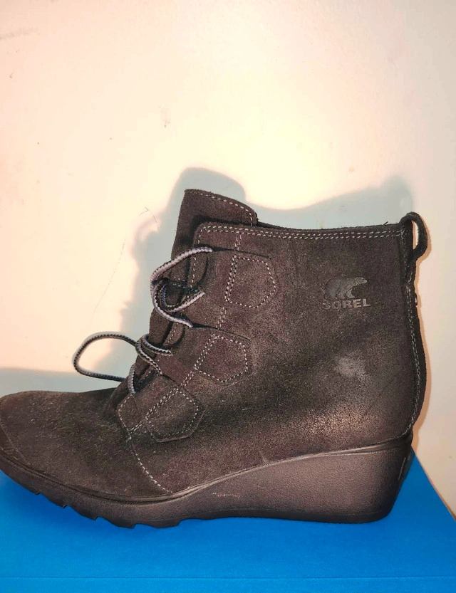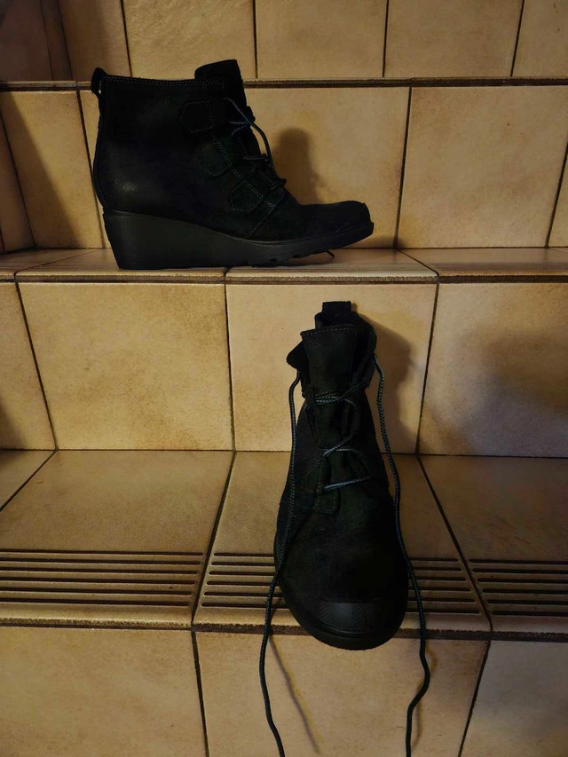 18Black Sorel Lace up booties. Sleek, industrial boot that looks fresh with wedge platform. Never worn Waterproof oiled suede leather upper provides durable support & a comfortable fit. Molded EVA footbed with arch support provides long lasting comfort & support. Molded rubber wedge with foam heel & forefoot inserts for comfort. Molded rubber sole provides durable traction on varied surfaces.